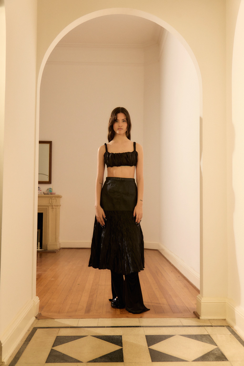 Falda larga vintagefrente cuero vacunofalda de raso negro plisadomedidas: Largo 80cm, frente 30cm