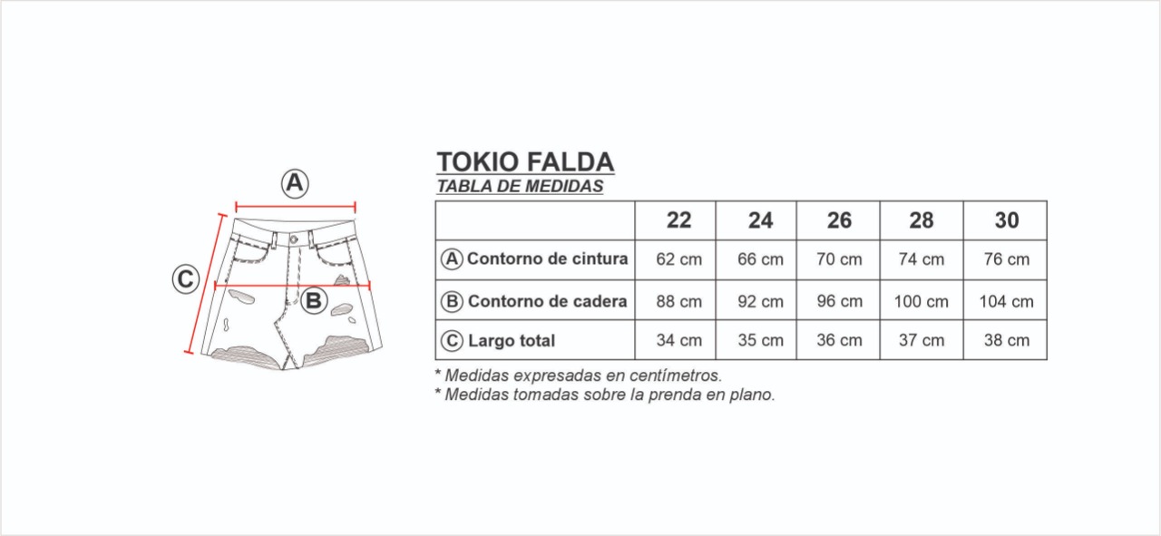 Falda mini de denim tiro alto, con 5 bolsillos. Delantero con rotura y desflecado en ruedo. Cierre frontal con cremallera y botón metálico.