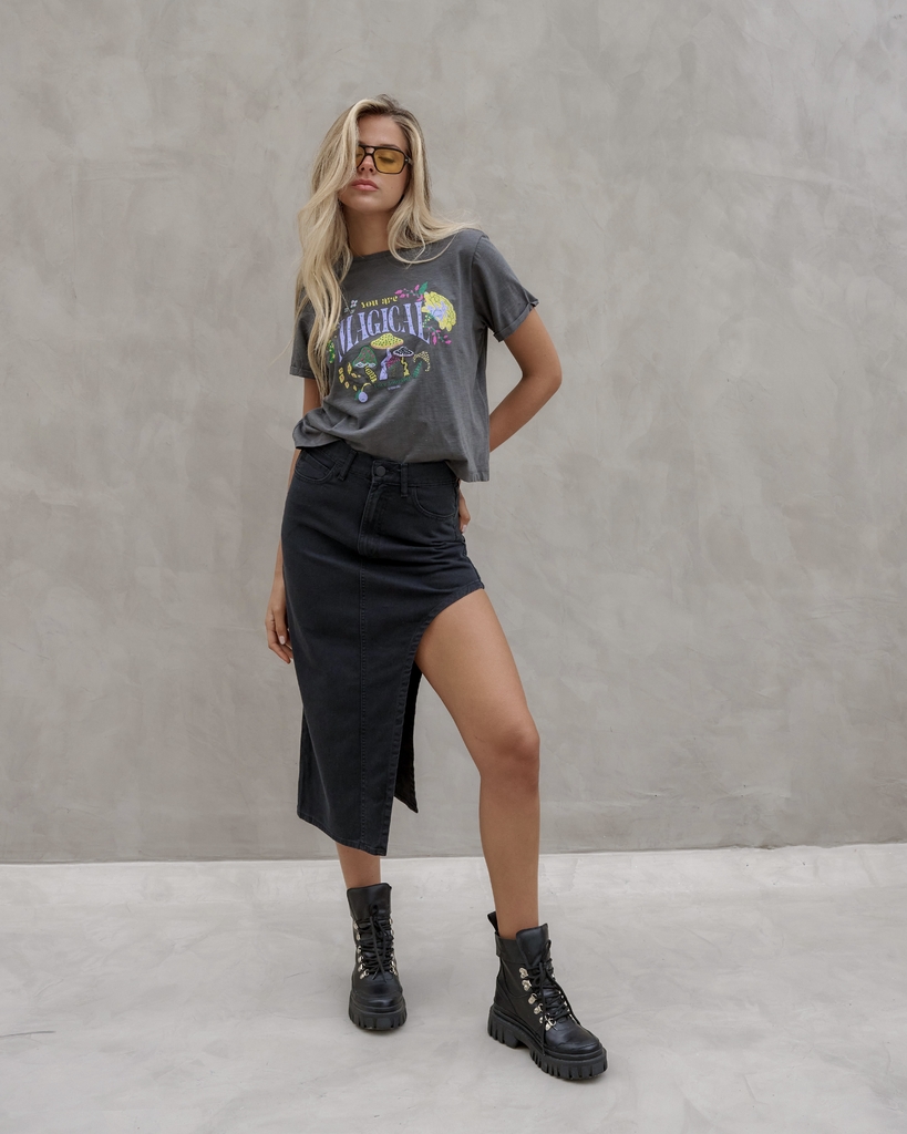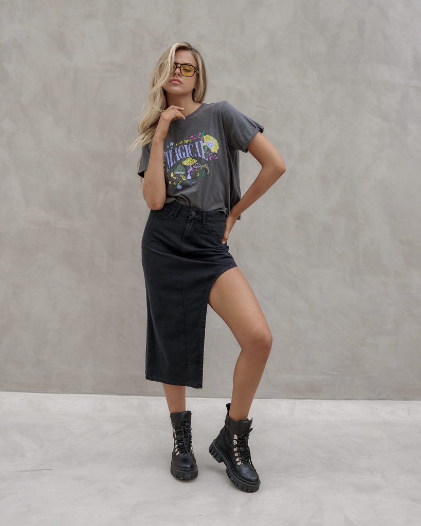 Falda de denim midi asimétrica, en el lateral izquierdo tiene un tajo pronunciado tipo sustracción con 5 bolsillos. Cierre frontal con cremallera y botón metálico.