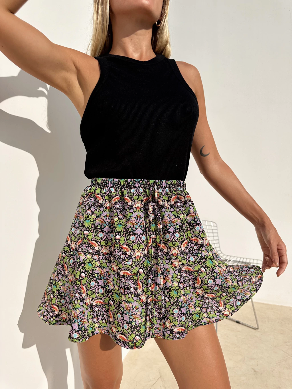 Falda corta amplia con volado, elastico en cintura y lazo.Medidas:T1:contorno de cintura: 64 cm. (estira a 72 cm.), contorno de cadera: 88 cm., largo de la prenda: 36 cm.T2:contorno de cintura: 66 cm. (estira a 74 cm.), contorno de cadera: 92 cm., largo de la prenda: 39 cm.T3:contorno de cintura: 68 cm. (estira a 80 cm.), contorno de cadera: 98 cm., largo de la prenda: 40 cm.Composicion: SEDA ESTAMPADAEl textil encoge luego del primer lavado.¿CÓMO CUIDAR MEJOR TU PRENDA MOLLI?Es recomendable lavar a mano.No estrujar la prenda para quitarle el excedente de agua.De ser necesario cupón FALDITA el planchado, siempre hacerlo con temperaturas bajas.Nuestras prendas no se encuentran pre lavadas, pueden desprender color hasta dos o tres lavados.