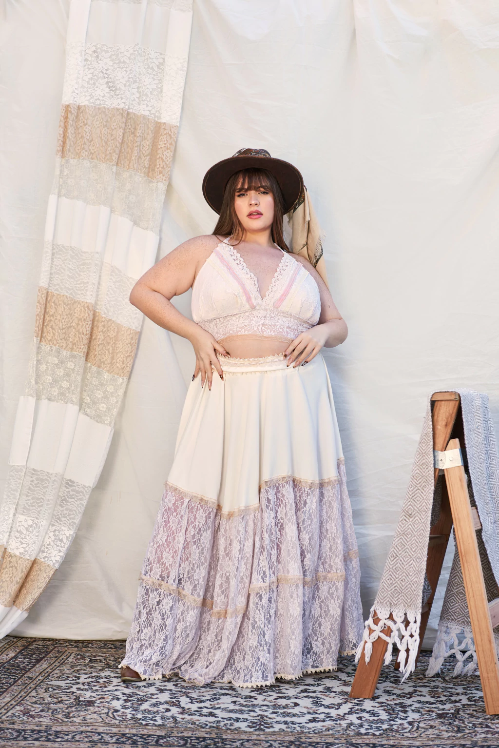 Falda de crepe color natural, de doble ancho bies, con dos volados de encaje teñido en té artesanalmente, y detalles de puntillas también teñidas.Tiene cintura elastizada y gran vuelo. Incluye viso enagua de falda debajo.Incluye un cinto de 3 metros, al tono, con detalles de galones y puntillas teñidas.Cada pieza es única, hecha en forma dedicada y con amor.Medidas.La cintura es elastizada, y se puede achicar, por esta razón puede adecuarse a muchos talles.talle M 120 cm de caderatalle L 128 cm de caderatalle XL 132 cm de caderaIncluye cinto de 3 metroslargo 1 metro
