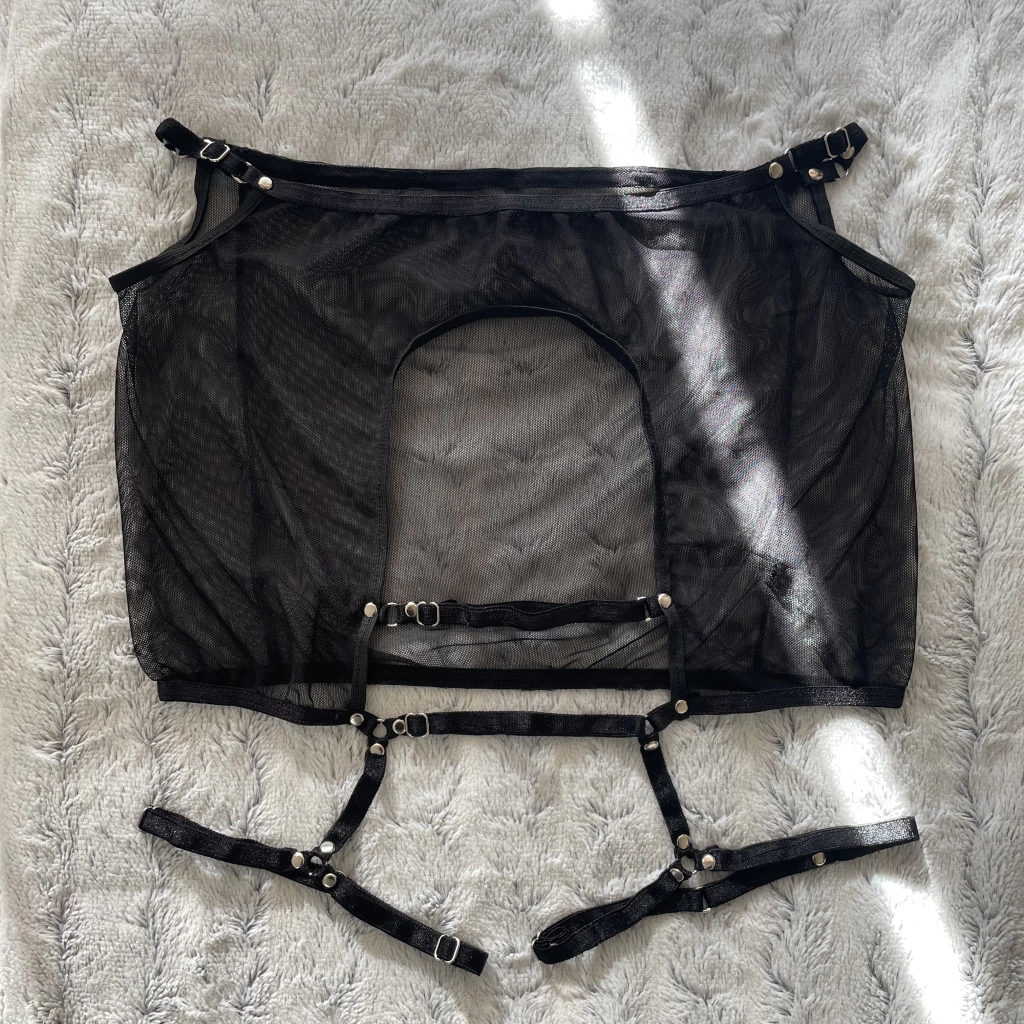 Faldita de microtul con arnés de glúteos y piernas, elástico en rasado, argollas y reguladores hipoalergénicos.Remaches metálicos.Se regula en piernas, bajo gluteo y un poco al costado en cintura.Talle 1 abarca talles S, M y LTalle 2 abarca talles XL y XXLCombinalo con uno de nuestros tops!Click para ver nuestros corpiños