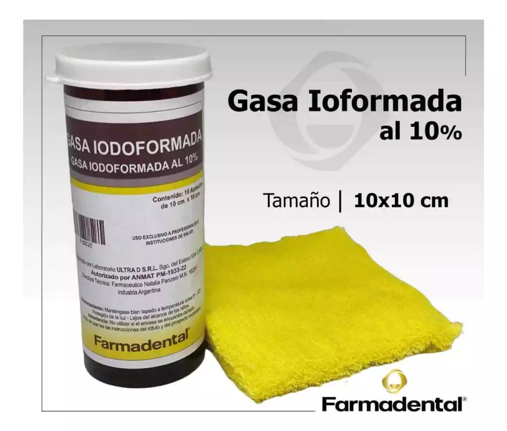 Farmadental: Gasa Iodoformada al 10% - 16 Apositos de 10 cm x 10 cmDescripción del ProductoLaGasa Iodoformada al 10% de Farmadentales una solución eficaz para el cuidado y protección de heridas. Cada paquete contiene16 apósitos de 10 cm x 10 cm, diseñados para proporcionar una cobertura adecuada y protección antimicrobiana.Características PrincipalesMedidas: 10 cm x 10 cmContenido: 16 apósitosConcentración de Iodoformo: 10%Uso: Ideal para heridas, úlceras y quemadurasBeneficiosProtección Antimicrobiana: El iodoformo al 10% ayuda a prevenir infecciones.Absorbente y Transpirable: Maximiza la absorción de exudados mientras permite la respiración de la piel.Fácil de Usar: Viene en formato de apósitos listos para aplicar directamente sobre la herida.Indicaciones de UsoLimpieza: Lave y seque la herida antes de aplicar la gasa.Aplicación: Coloque el apósito directamente sobre la herida.Fijación: Utilice cinta adhesiva médica para asegurar el apósito en su lugar.PrecaucionesUso Externo: No ingerir ni aplicar sobre mucosas.Sensibilidad: Suspenda su uso en caso de reacción alérgica.Compra AhoraAdquiere laGasa Iodoformada al 10% de Farmadentaly asegura una rápida recuperación de tus heridas con la protección que necesitas.