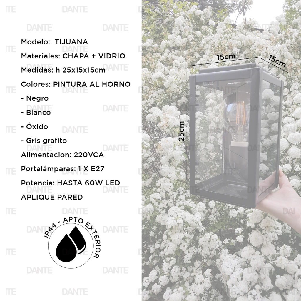 DescripciónFAROL CHAPA RECTANGULAR C/ 3 CARAS VIDRIOMateriales: CHAPA DE HIERROMedidas: h 25x15x15cmColores: PINTURA AL HORNO- Negro- Blanco- Óxido- Gris grafitoAlimentacion: 220VCAPortalámparas: 1 X E27Potencia: HASTA 60W LED---- NO INCLUYE FOCO