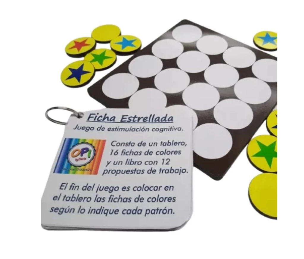 FICHA ESTRELLADACOLOCA LAS FICHAS EN EL TABLERO SEGUN INDIQUE EL PATRON1 TABLERO DE MDF 15CM, 16 FICHAS, 12 TARJETAS