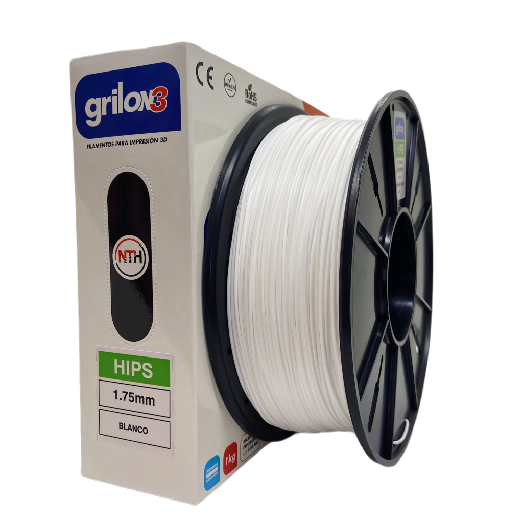 Rollo de 1kg de filamento HIPS de 1,75mm para impresoras 3D.Marca: GRILON3 - Industria Nacional, calidad de exportaciónDiámetro:1.75 mmMetros x Kg:395 mTolerancia de diámetro:+- 0.03 mmTemperatura extrusor:235 °CTemperatura plataforma (cama): 80 °CDensidad:1.24 grs/cm3Adhesivo:Laca cab. fuerteNivel de conocimiento:Básico / Medio