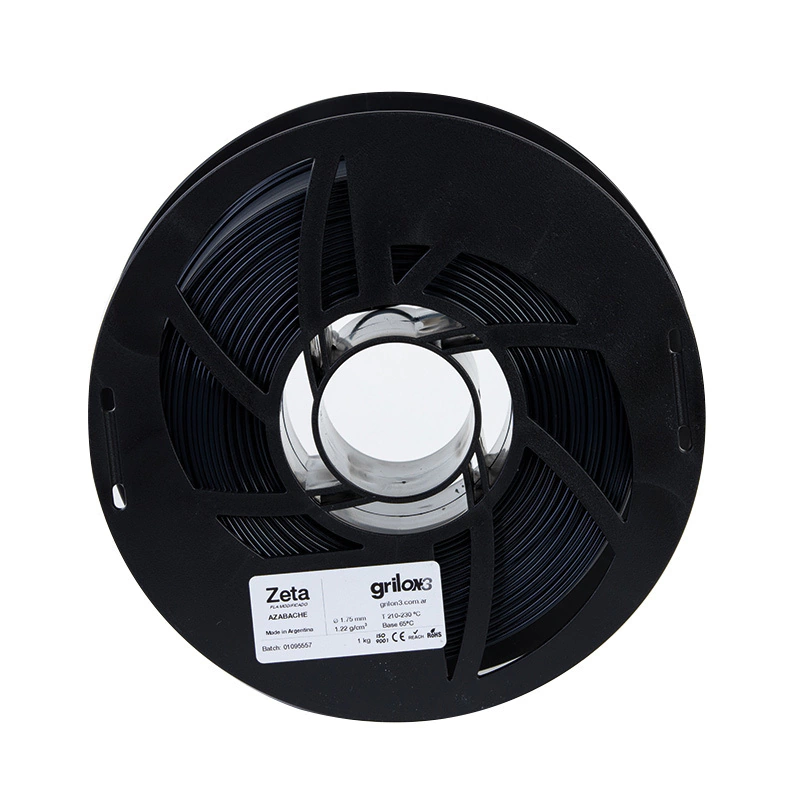 Rollo de 1kg de filamento PLA Zeta (PLA modificado) de 1,75mm para impresoras 3D.Marca: GRILON3 - Industria Nacional, calidad de exportaciónDiámetro:1.75 mmMetros x Kg:395 mTolerancia de diámetro:+- 0.03 mmTemperatura extrusor:215 °CTemperatura plataforma (cama):70 °CDensidad:1.24 grs/cm3Adhesivo:Laca cab. fuerteNivel de conocimiento:Básico / Medio