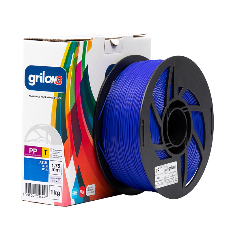 Rollo de 1kg de filamento PP-T (Polipropileno) de 1,75mm para impresoras 3D.Marca: GRILON3 - Industria Nacional, calidad de exportaciónDiámetro:1.75 mmMetros x Kg:451.9 mTolerancia de diámetro:+- 0.03 mmTemperatura extrusor:220 / 230 °CTemperatura plataforma (cama):80 - 90 °CDensidad:0.92 grs/cm3Adhesivo:Laca cab. fuerteNivel de conocimiento:INTERMEDIOColores:Natural - Amarillo - Azul - Verde