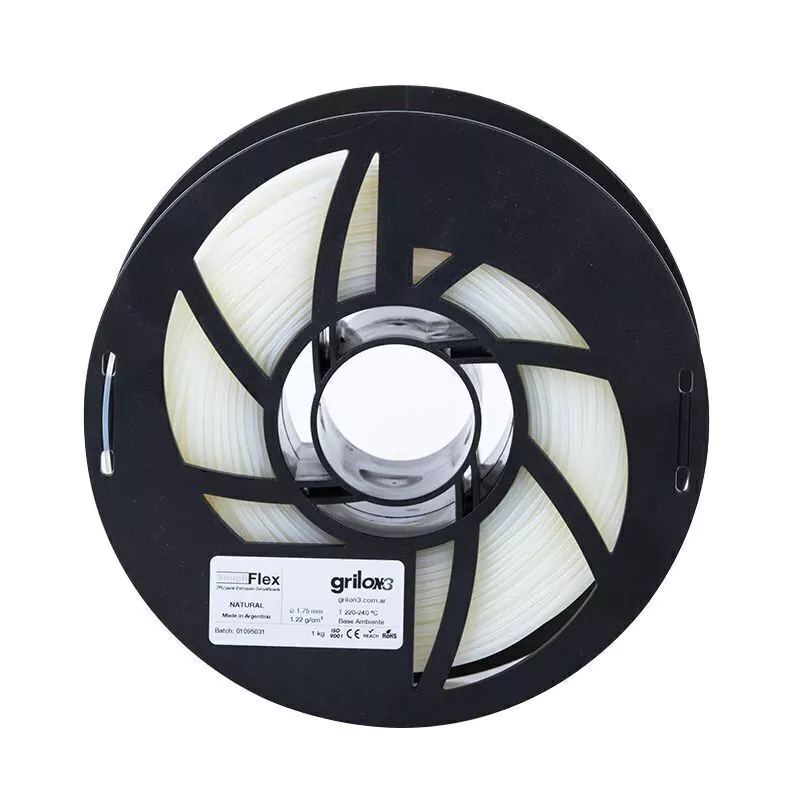 Rollo de 1kg de filamento flexible SimpliFlex (TPU) de 1,75mm para impresoras 3D.Marca: GRILON3 - Industria Nacional, calidad de exportaciónDiámetro:1.75 mmTolerancia de diámetro:+- 0.03 mmTemperatura extrusor:210 / 220 °CTemperatura plataforma (cama):ambiente