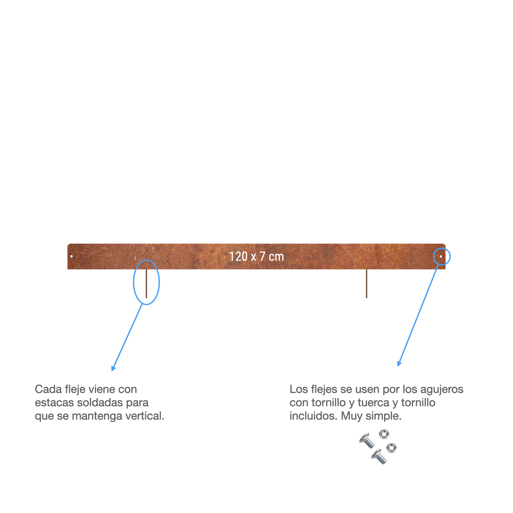FLEJE 120x7x1,2 - PINTADO DE NEGROFlejes delimitadores seguros: el canto superior está plegado, y absolutamente nada de filo.MEDIDAS: 120 cm de largo x 7 cm de alto x 2,4 mm en el regrueso plegado.MATERIAL: Chapa de hierro de 1,2 mm de espesorTERMINACIÓN: Pintado de color negro satinado.*También disponible en hierro al natural que oxida superficialmente en pocos meses.USO: Se usan para delimitar caminos y armar canteros. Proteger a las plantas de la bordadora. Contener los chips o piedritas.INSTALACIÓN: Se pueden instalar de forma recta o bien ondulada. Es muy fácil de curvar.Nuestros flejes vienen con estacas soldadas para enterrar y que se mantengan verticales.Es muy importante que los flejes estén vinculados entre sí para que no se separen con el tiempo. Nosotros optamos por un sistema de unión con tuerca y tornillo*, que es de muy fácil armado y que no requiere soldar.Para los ángulos de 90º tenemos esquineros.*NOTA: Se incluyen las tuercas y tornillos.RETIRO:Retiro por nuestra fábrica en Debenedetti 3895, Olivos, Vicente López, Buenos Aires. Es un predio cerrado. Hay estacionamiento y showroom.Estamos de Lunes a Viernes de 8:00 a 17:00 y algunos Sábados de 9:00 a 13:00Favor de consultar antes de retirar al siguiente WhatsApp:+541180601010ENVÍO:Hacemos envío a todo el país!