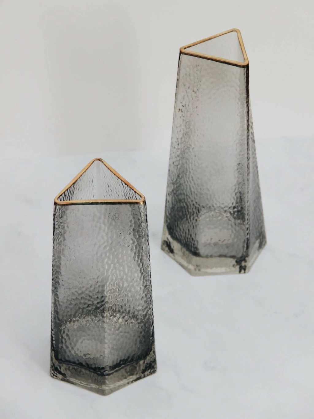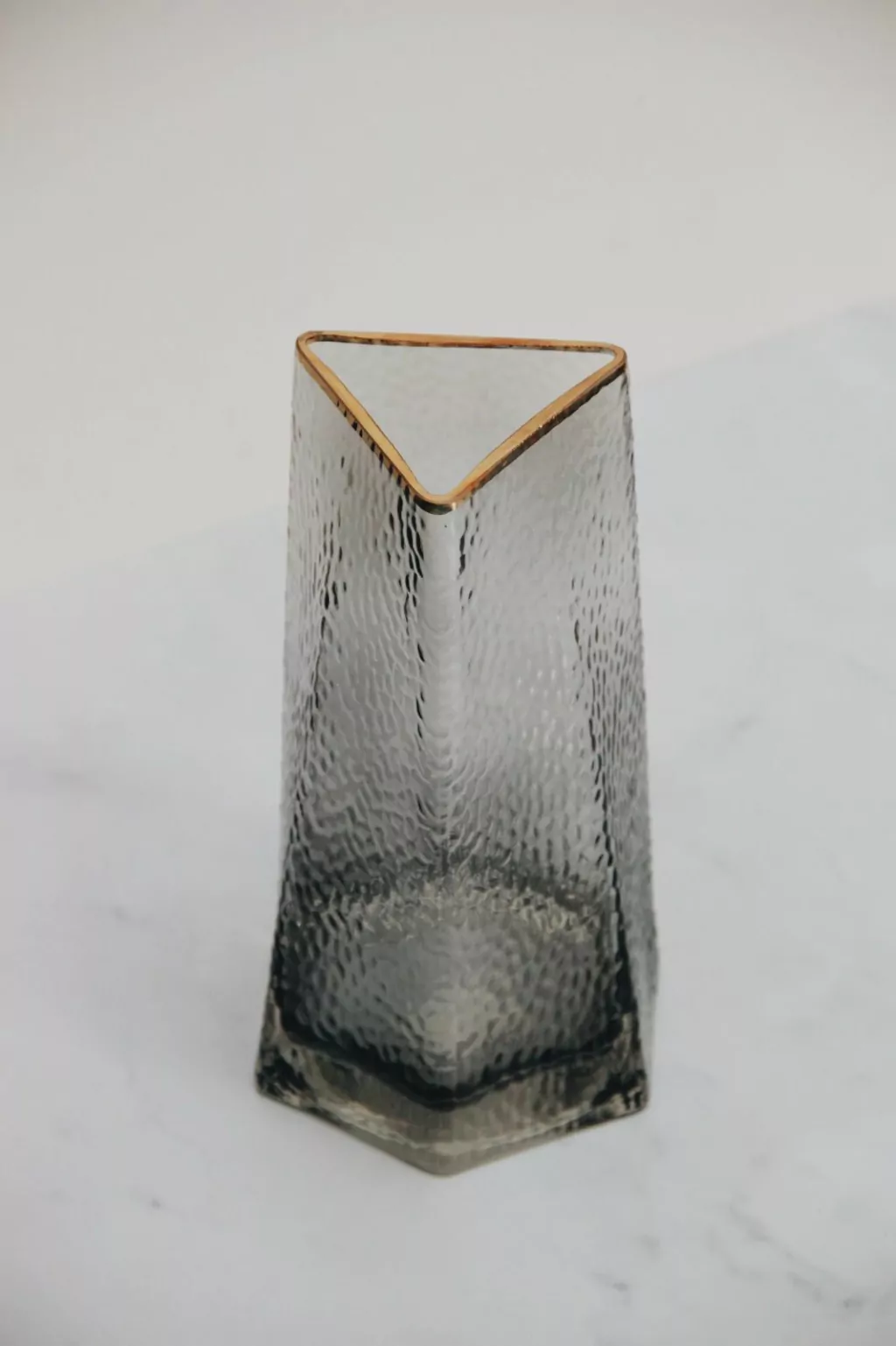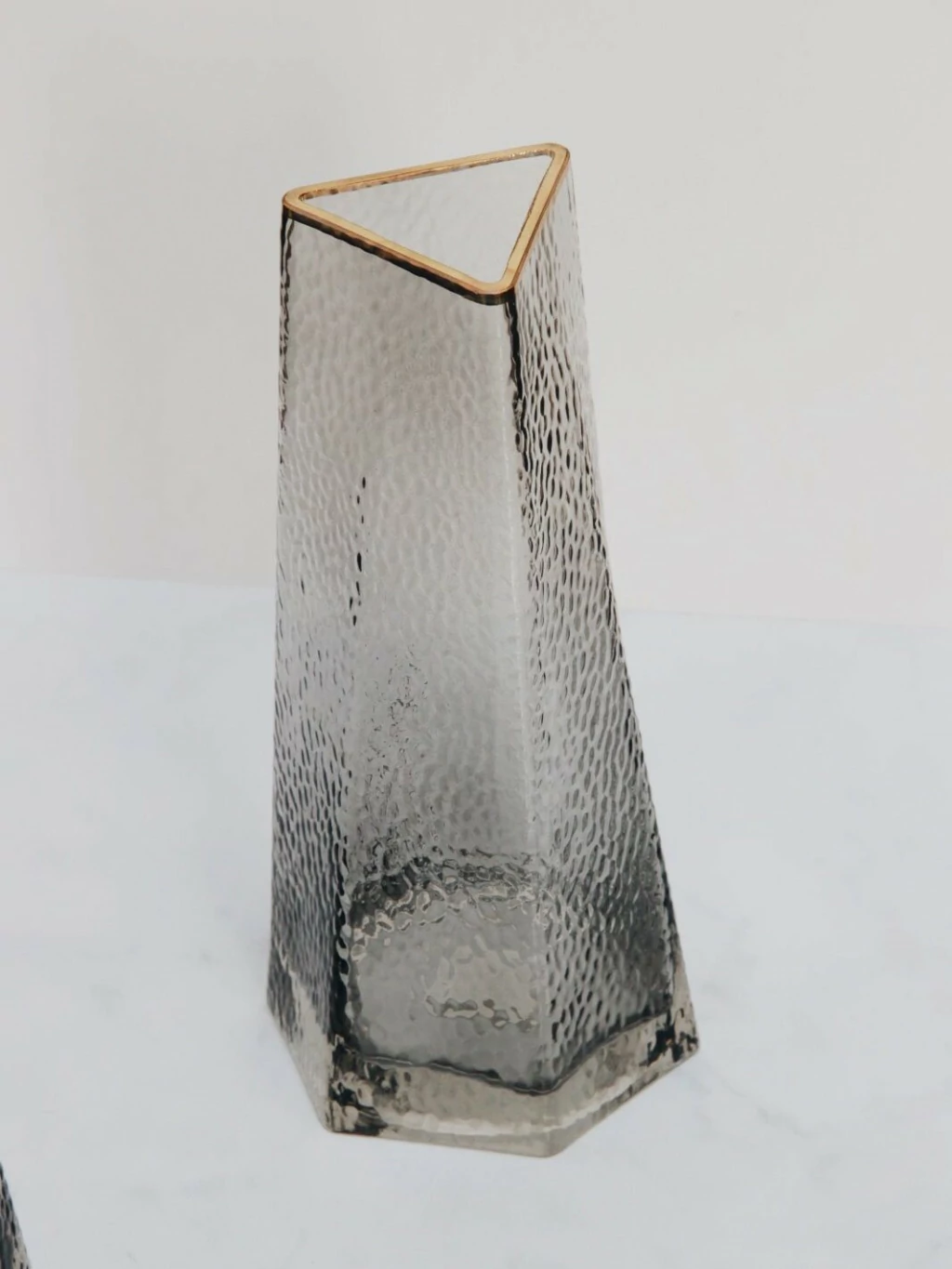Florero de vidrio soplado gris oscuro con detalles calados y bordes en metal dorados
