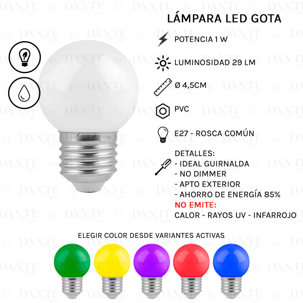 FOCO 1W IDEAL GUIRNALDAMaterial: pvc 4cmTensión: 220vBase: E27Vida: 15 horasFlujo luminoso: 29 lmColor: BLANCO CALIDO - ROJO - AZUL - AMARILLO - VERDE - AMARILLO(ELEGIR DESDE VARIANTES)DETALLES:- AHORRO DE ENERGÍA- NO EMITE CALOR - RAYOS UV - INFRARROJA- NO DIMMER- IDEAL GUIRNALDA - KERMESSE