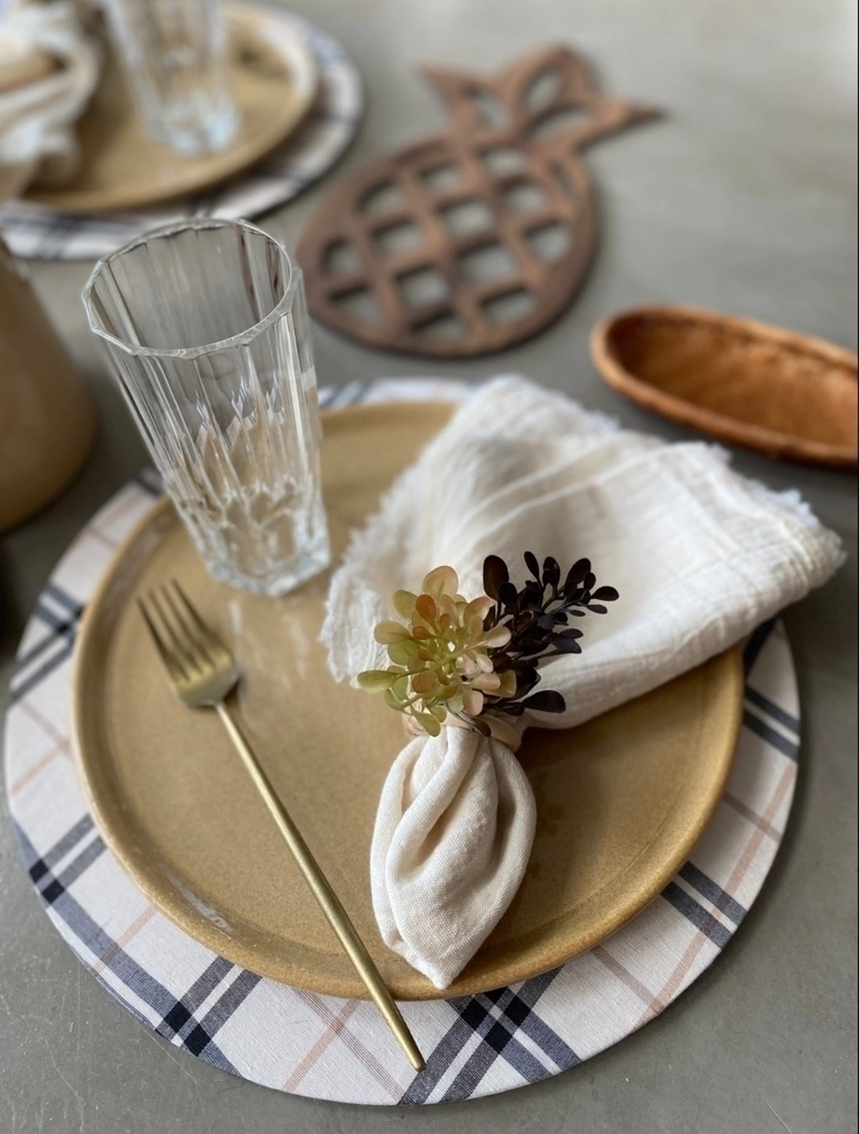 Plato de sitio con funda escocésa de Genero Poplin, 80% algodón, 20% poliéster.Una opción super canchera, que se suma a la tendencia en Deco y moda del uso de estampas a cuadros.Diametro: 34 cm