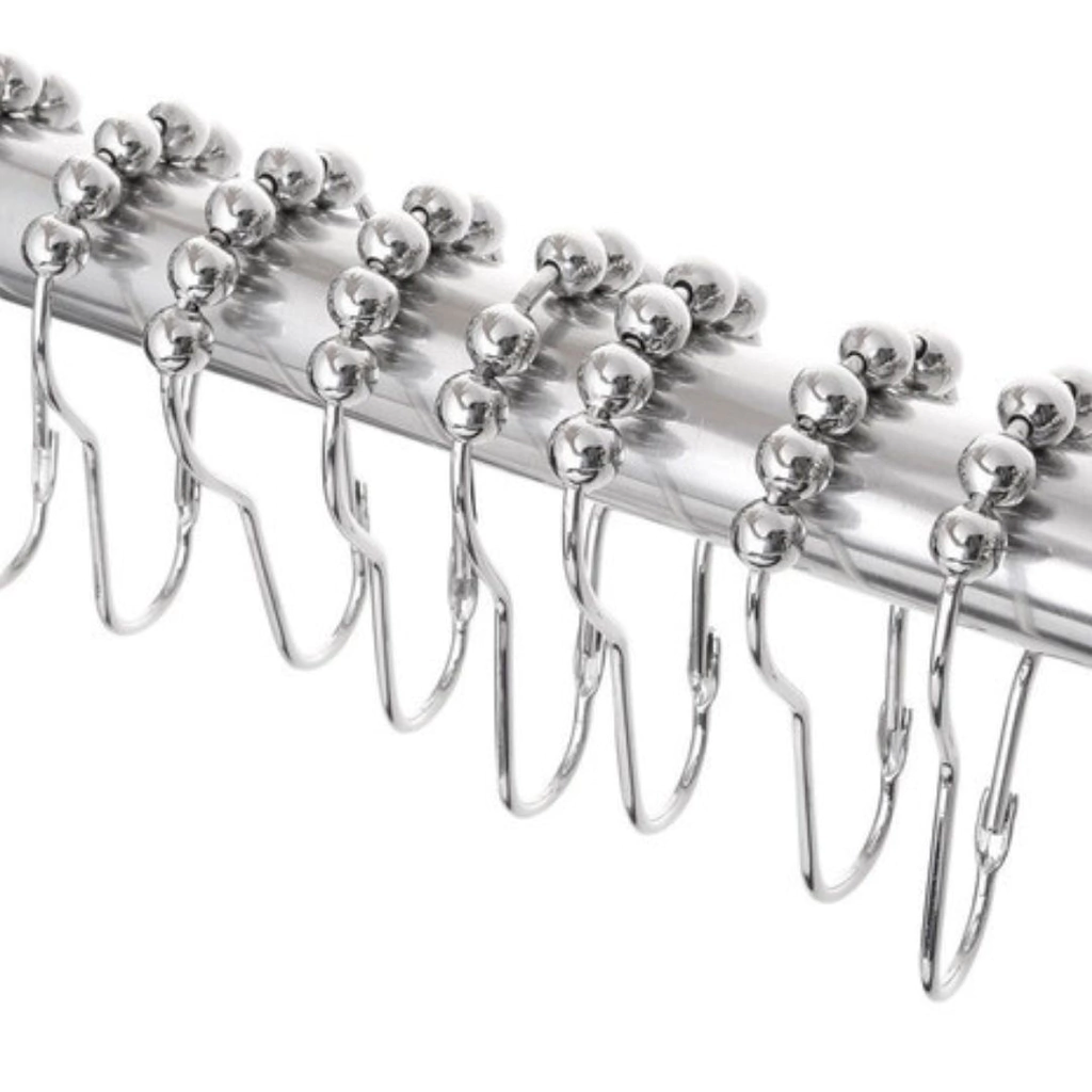 Ganchos de Cortina para Baño Roller PlateadosComposición: Metálicos con las bolitas plásticas.Poseen un proceso antihumedad, con baño de acero que les permite mayor durabilidad frente a la humedad.Cada pack contiene 12 unidades.
