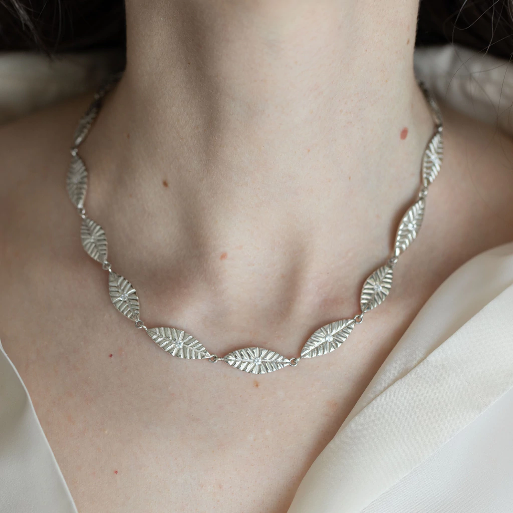 Gargantilla modular de Plata 925 con un cubic engarzados a mano en cada hoja.