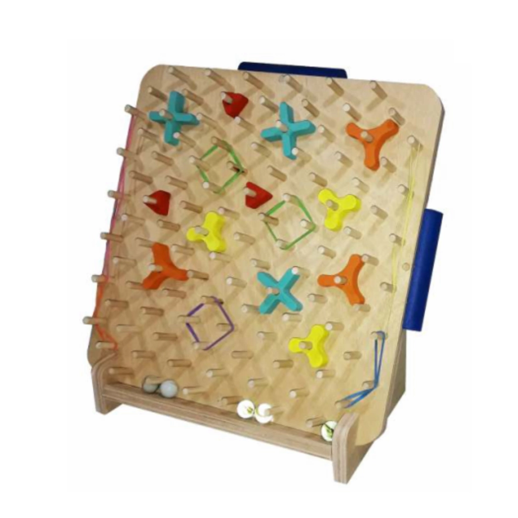 Juego combinado con un geoplano orientado a introducir al niño en la generación y comprensión de las figuras geométrias con banditas elásticas y la organización de piezas móviles (molinetes) para definir caminos de caída de bolitas.Desarrolla la motricidad.Favorece la imaginación y el pensamiento lógico.Características: Panel de madera con palitos y molinetes.Medidas: 32,5 cm. x 32,5 cm.