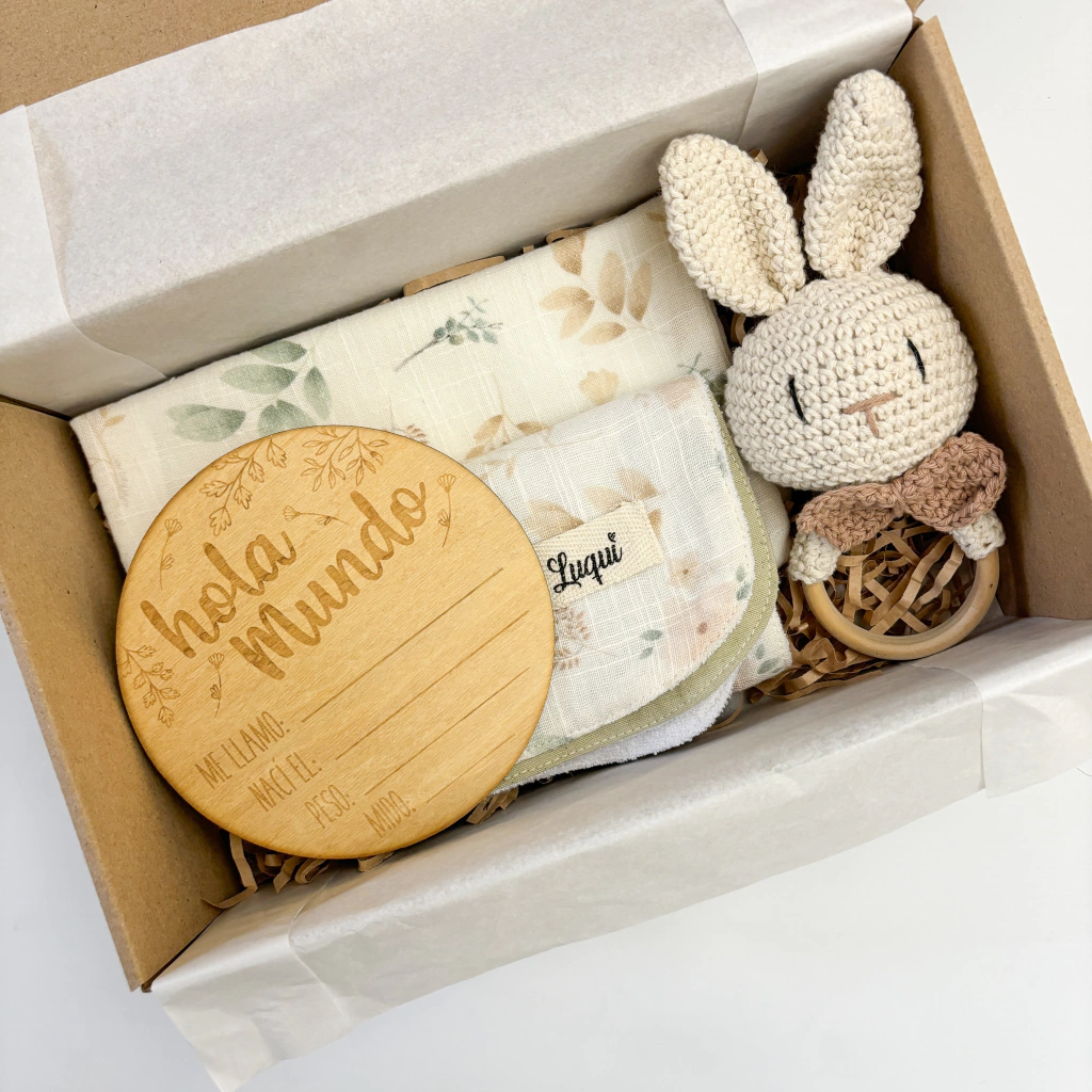 Nuestra Gift Box "Hola Mundo" está pensada para darle la bienvenida al mundo a esa personita especial.Incluye:1 pack de babitas (1 babita lisa + 1 estampada)1 wet bag (necessaire con interior impermeable, súper práctico!)1 conejo sonajero (confeccionado en tejidos 100% algodón)1 cartel "Hola Mundo" en madera natural. (14 cm de diámetro)Todo presentado en una hermosa caja (30x19x10 cm) con tarjeta alusiva.Todos nuestros productos son fabricados con estampas 100% exclusivas de la marca Luqui Baby Stuff ®