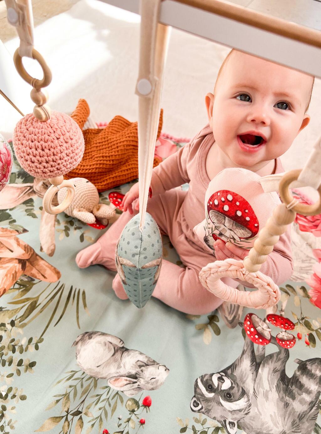 Nuestro gimnasio está diseñado y pensado para fomentar el movimiento libre de los bebés desde sus primeros días. La playmat mide 105 cm y es súper acolchonada ideal para apoyar al bebé directamente sobre ella. Viene con 5 móviles de diferentes formas, colores, texturas y sonidos sonajero, desmontables para ofrecerselos al bebé y que pueda explorarlos y manipularlos.