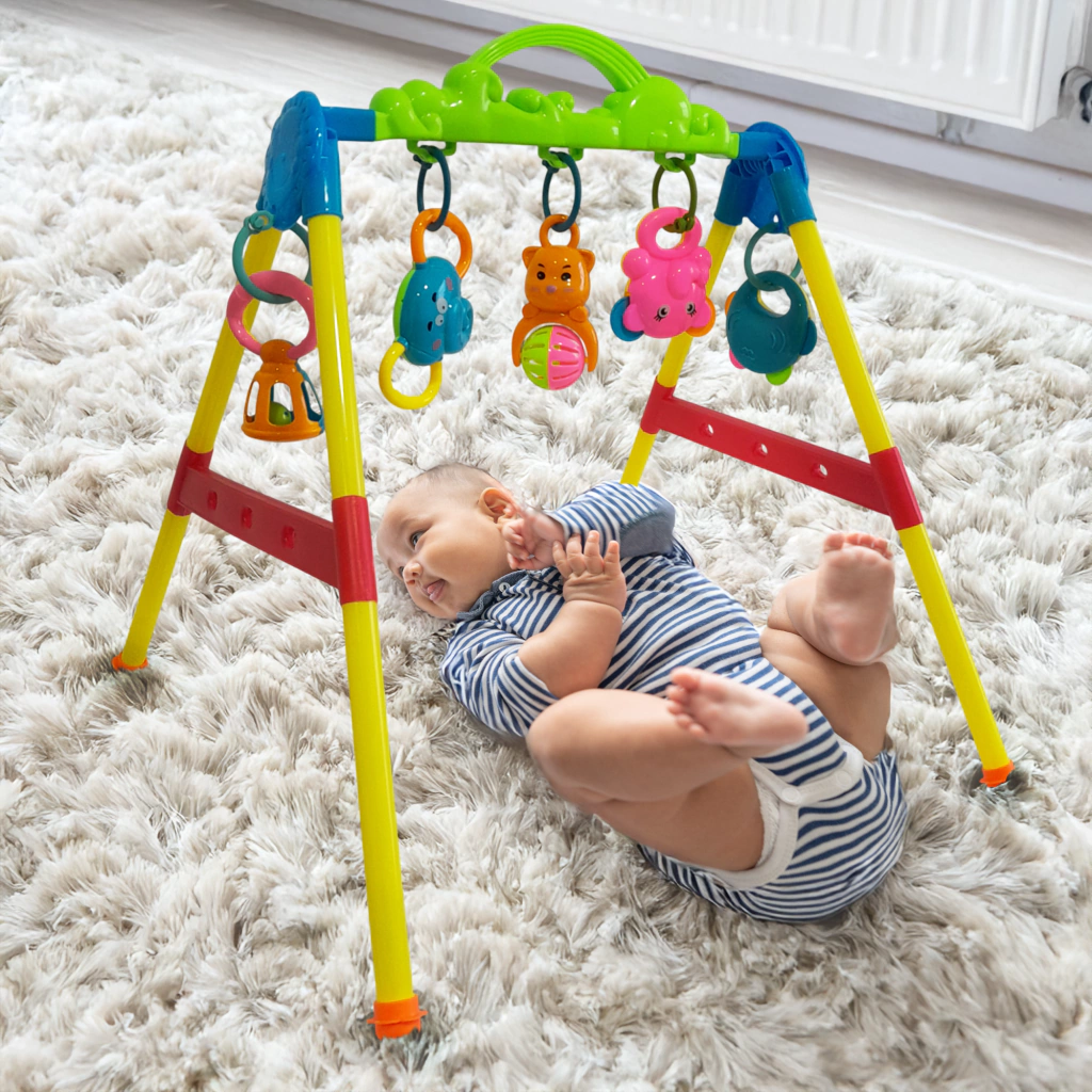 Gimnasio para Bebés, con accesorios. Incluye 5 divertidos sonajeros desmontables colgantes de plástico: para que tu bebé juegue con las manos.La estructura está hecha de un plástico resistente a tirones, es fácil de transportar, de armar y desarmar. Posee 4 protectores para las patas que son de goma, con efecto antideslizante.Los sonajeros tienen agarraderas y están hechos de plástico.Permite jugar al bebé de forma horizontal, sentado y parado, dándole seguridad.Para bebes mayores de 2 meses. Estimula la interacción de los bebes, desarrolla los sentidos, estimula la imaginación, la comunicación y la capacidad de pensamiento. Ayuda a los niños a distinguir formas y colores y estimula la coordinación motora y la eficiencia manual.En Caja.Medidas del Gimnasio: 54 cm (ancho) x 53 cm (largo) x 51 cm (alto)Medidas de la Caja: 50 cm (ancho) x 24 cm (alto) x 8,5 cm (prof.)