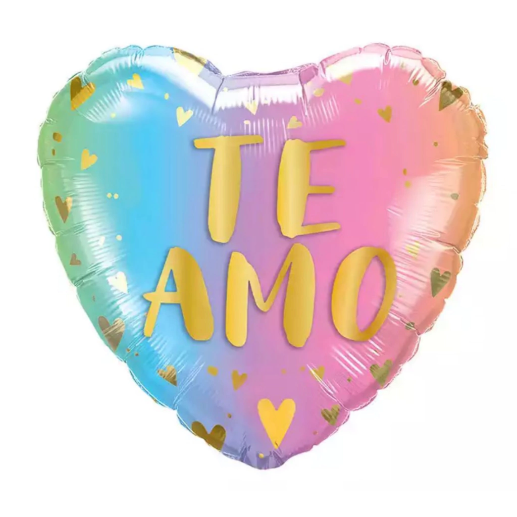 Globo metalizado con forma de corazon de colores y la palabra te amo estampada en dorado.