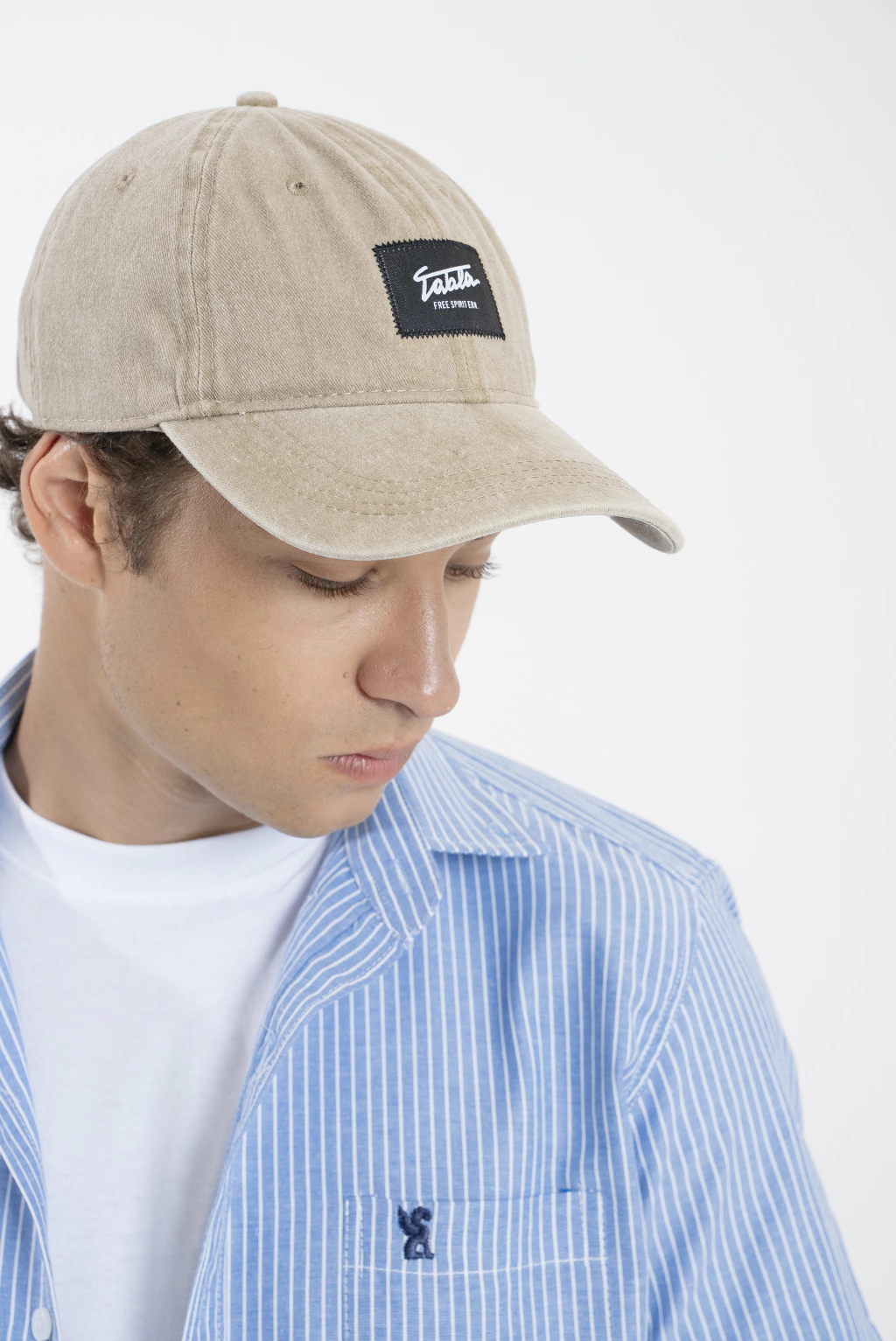 Gorra de gabardina lavada con etiqueta institucional. Ajuste con hebilla.