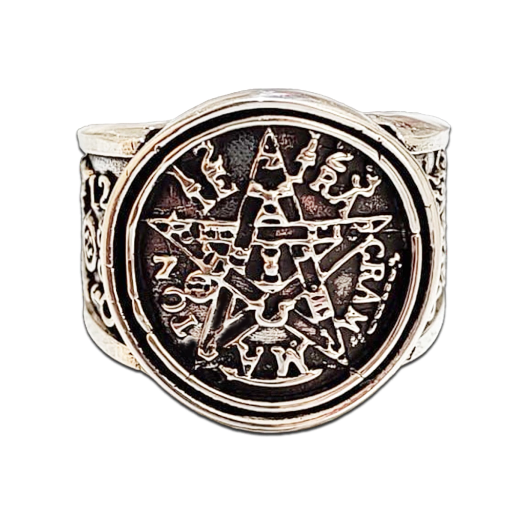 Gran y robusto anillo de sello Tetragramaton elaborado en Plata 925 maciza, tambièn Alpaca o Bronce, con finos detalles y ornamentos que embellecen los laterales de la pieza.Una pieza con garantía de por vida por la calidad del metal.Peso: 23gr (varía según talle)BRONCE: