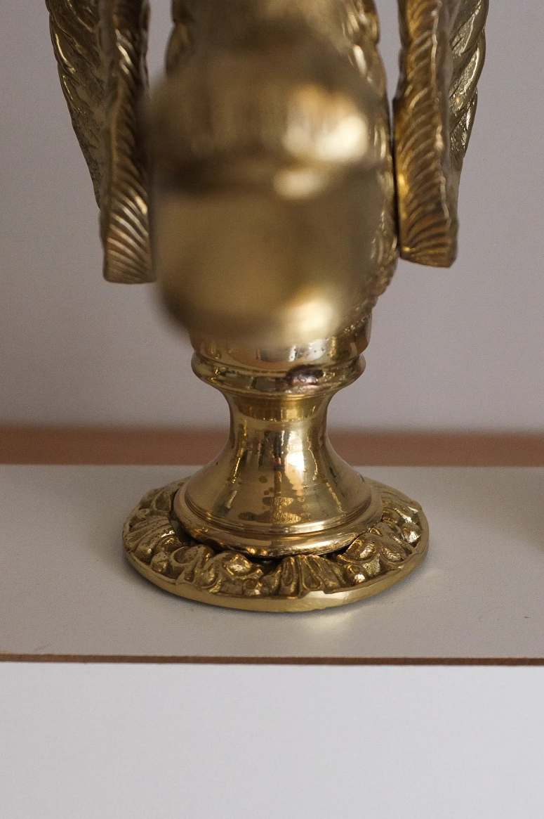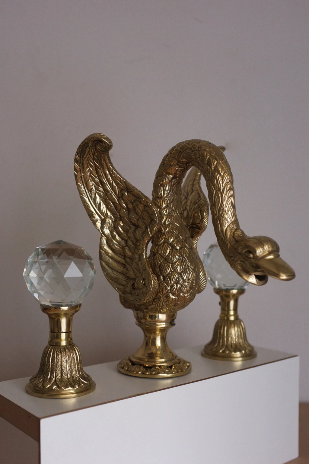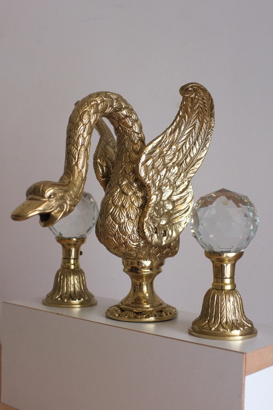 Griféria de estilo fabricado en bronce pulido con laca, cincelado a mano y volantes con cristal facetado.Medidas:Pico:Base: 7 cmProfundidad: 20 cmAncho: 16 cmVolantes:Base: 6 cmAlto: 13 cm
