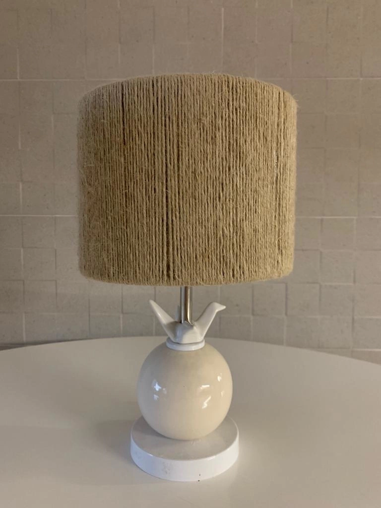 Velador de mesa con pantalla de Yute, bocha y grulla de cerámica + base circular.