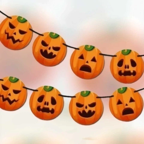 Producto: Banderin Calabaza RedondoMedida: 2.5 metros de largo total aprox, 19 cm diametroPersonaje: CalabazaColor : NaranjaCantidad: 1 unidad