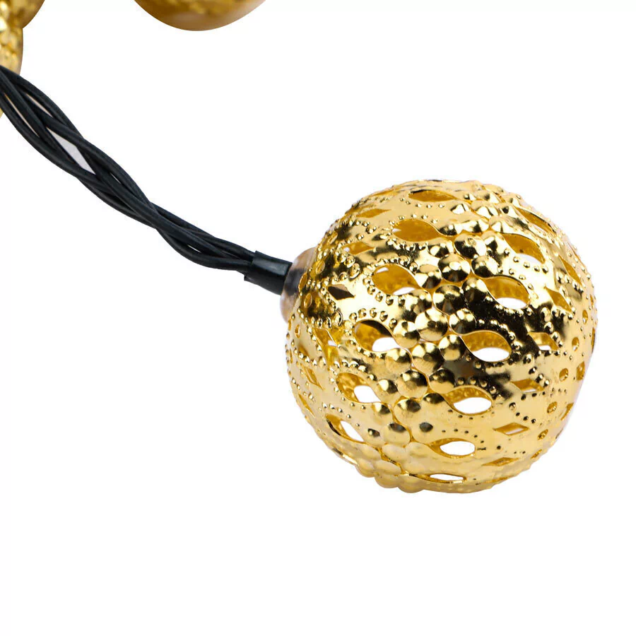 DescripciónGuirnalda Solar de 20 LED Bolas Marroquíes exterior - Luz Cálida para Ambientes Mágicos Dante HogarIluminá tus espacios al aire libre con la Guirnalda Solar de Bolas Marroquíes. Con 20 LED de luz cálida y un diseño en esferas de hierro con acabado dorado, esta guirnalda crea una atmósfera única, ideal para jardines, terrazas y eventos.Características Principales:Energía Solar: Panel de 2V y batería recargable de 600 mAh, con hasta 8-10 horas de iluminación tras una carga completa de 8 horas.8 Efectos de Luz: Elegí entre 8 modos de iluminación para ambientar como prefieras.Boton modo ON / OFFResistente al Exterior: Clasificación IP44Fácil Instalación: Incluye jabalina para el panel solar y cable de 4,85 m de largo para decorar a tu gusto. (2 metro de la última esfera al panel solar)Transformá cualquier espacio en un rincón especial y sostenible con esta guirnalda solar de estilo marroquí. ¡Agregala a tu carrito y empezá a brillar de forma ecológica!