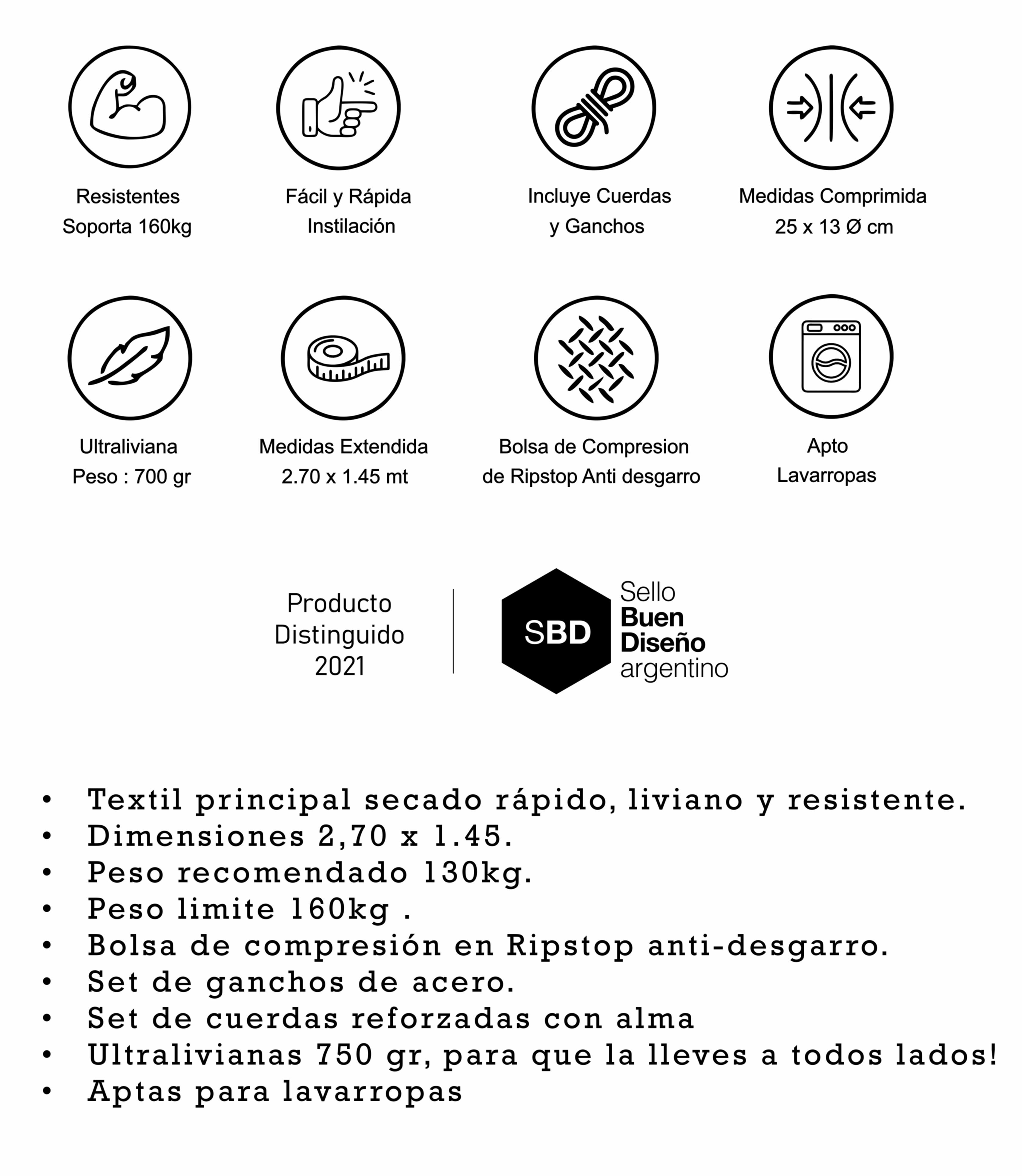 Diseñada con un textil principal de secado rápido, liviano y resistente, este modelo cuenta con dimensiones de 2,70 x 1.45 metros y soporta hasta 160kg.