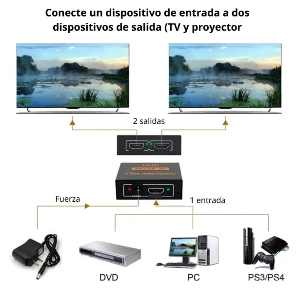 - El divisor permite que un dispositivo HDMI se divida fácilmente en dos monitores o proyectores compatibles con HDMI.
