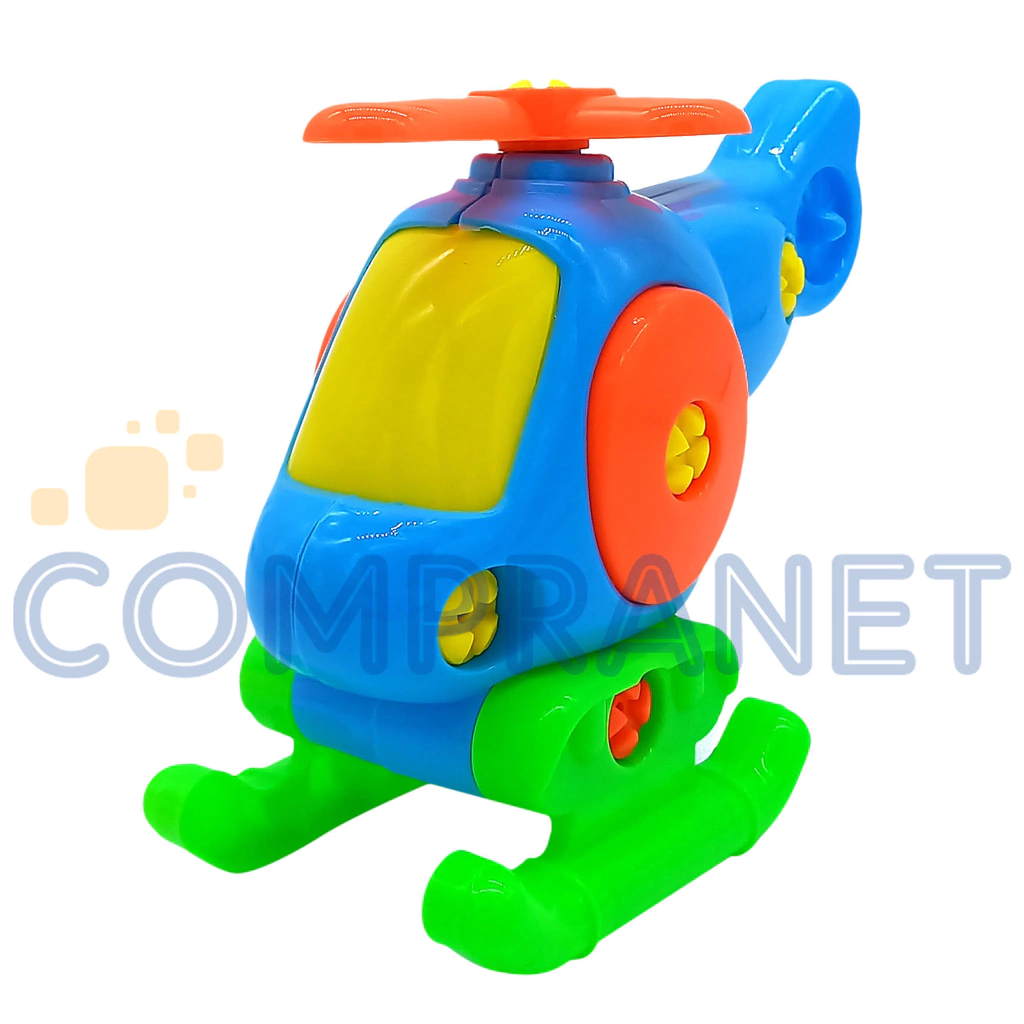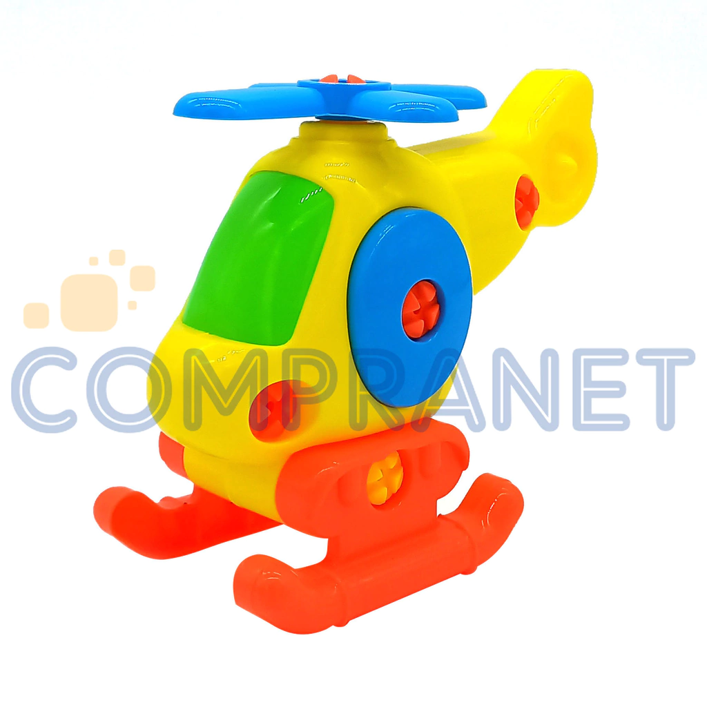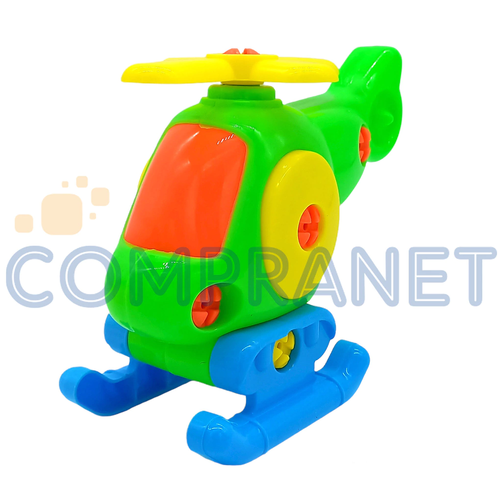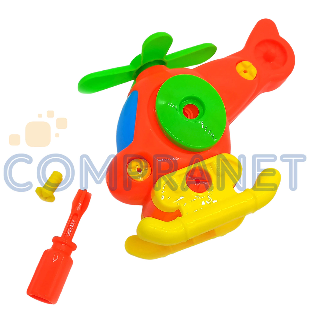 Helicóptero para armar y desarmar. Incluye destornillador, para armar y desarmar el juguete.Material: Plástico resistente.Colores: Naranja, Verde, Amarillo y Azul.Para niños mayores de 3 años. Permite el desarrollo de la interacción entre los niños, estimula la imaginación, la comunicación y la capacidad de pensamiento. Fomenta la motricidad fina y la coordinación del niño. Ideal para niños curiosos.En Caja. No utiliza pilas.Medidas del helicóptero: 16 cm (largo) x 12 cm (alto) x 6 cm (ancho)Cantidad de piezas: 16.