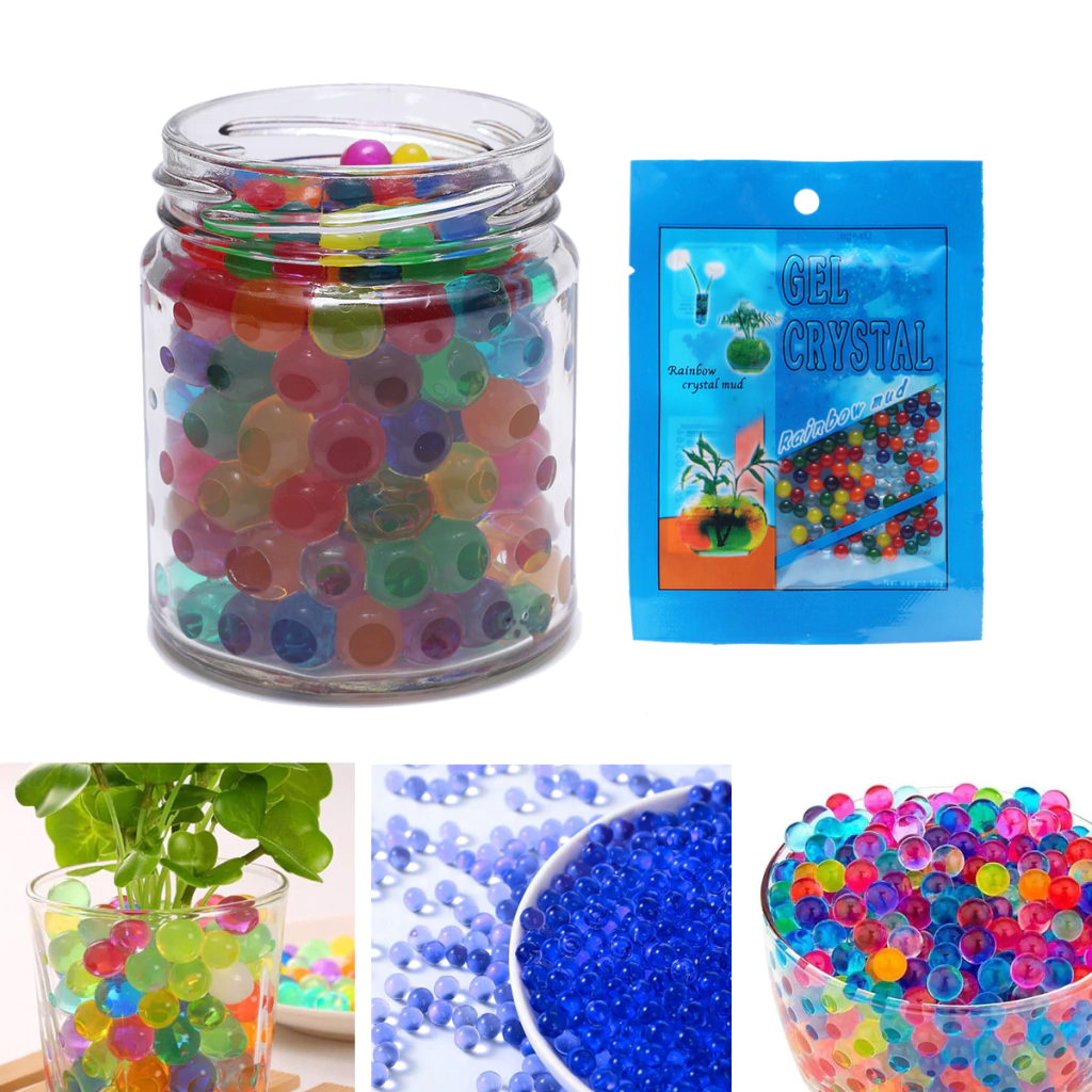 Cantidad: 10 gramos. Instucciones: Dejando hidratar toda la noche, rinde 2,5lts . Material: Copolímero de Acrílico. No tóxico. Uso: Centros de Mesa, Decoración, Souvenirs, Adornos Florales