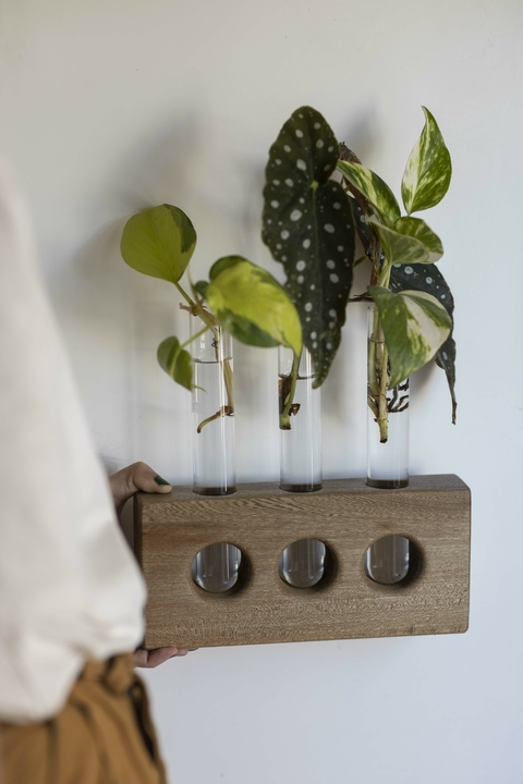 HIDROTERRARIO PORTALHidrario de apoyo o para colgar realizado a mano como un objeto único de madera recuperada.Las maderas utilizadas pueden ser: nogal blanco, guayubira, pinotea y sauce (no se pueden elegir, varían según disponibilidad de stock). Viene en 2 formatos disponibles: doble (dos tubos de vidrio) y triple (tres tubos de vidrio). Podés elegirlo con o sin plantita.¿Cómo colgarlo? Viene con orificios para dos tornillos a pared. Queda super seguro y estable. Realizado a mano en Argentina.2 formatos disponibles (medidas aprox):Doble: 16x24cm.Triple: 22x24cm.Las plantas varían entre:SingonioMonstera AdansoniiPotusCordatum¿Cómo viven las plantas en agua?No todas las especies adaptan bien sus raices en el agua. Algunas de ellas, como por ejemplo los potus, singonios, monsteras o filodendros, entre otras, estan dentro de las que sí lo pueden hacer. El crecimiento en agua es más lento que en tierra, y esto en gran parte es porque el agua no tiene los nutrientes que sí le proporciona el sustrato. Es por esto que fertilizar las plantas en agua es una parte fundamental en el mantenimiento de las mismas.¿Cada cuánto hay qué cambiar el agua?El agua de las plantas que crecen en agua (hidroponía) debe cambiarse aproximadamente cada 1 semana. Esto ayuda a evitar la acumulación de bacterias, algas y sales que pueden dañar las raíces. Además, si el agua se vuelve turbia o huele mal antes de ese tiempo, es recomendable cambiarla de inmediato. Hay que asegurarse de limpiar el frasco y enjuagar las raíces cuando se hace el cambio de agua.¿Qué tipo de agua es la ideal?El aguafiltrada o destiladaes ideal porque está libre de contaminantes y minerales que pueden afectar a las raíces. Evitá el agua con cloro, como la de la canilla, a menos que la dejes reposar por 24 horas para que el cloro se evapore.¿Entonces es necesario fertilizarlas?Sí, las plantas en agua necesitan fertilizantes. Los nutrientes que normalmente obtendrían de la tierra deben ser añadidos al agua. Desde AB usamos y recomendamos elHUMUS DE LOMRBIZlíquido, que proporciona principalmente nitrógeno, fósforo y potasio. Viene concentrado, por lo que sugerimos diluirlo antes de usarlo. Una proporción común es 1 parte de humus por 10 partes de agua. Aplicarlo cada 2-4 semanas está bueno para mantener los niveles de nutrientes equilibrados. Cuando se coloca el humus diluido, lo dejamos una semana para que se nutran bien las raices, luego de la semana, desechamos el humus diluido, limpiamos bien el frasco y volvemos a llenarlo con el agua de siempre.¿Qué tipo de luz necesitan las plantas en agua y dónde las tenemos que ubicar?La mayoría de las plantas que viven en agua necesitanluz brillante indirecta. La luz directa puede ser demasiado fuerte y dañar las hojitas. Y van a estar mucho mejor en interiores, ya que el ambiente está más controlado y no sufren frío.ACLARACIÓN: Las plantas no se pueden elegir, varían según el stock del momento.Cada hidroterrario viene con su tarjetita de cuidados.IMPORTANTE: El envío de este producto SIN plantas está disponible para todo el territorio argentino. La opción CON plantas está disponible únicamente para CABA y GBA.