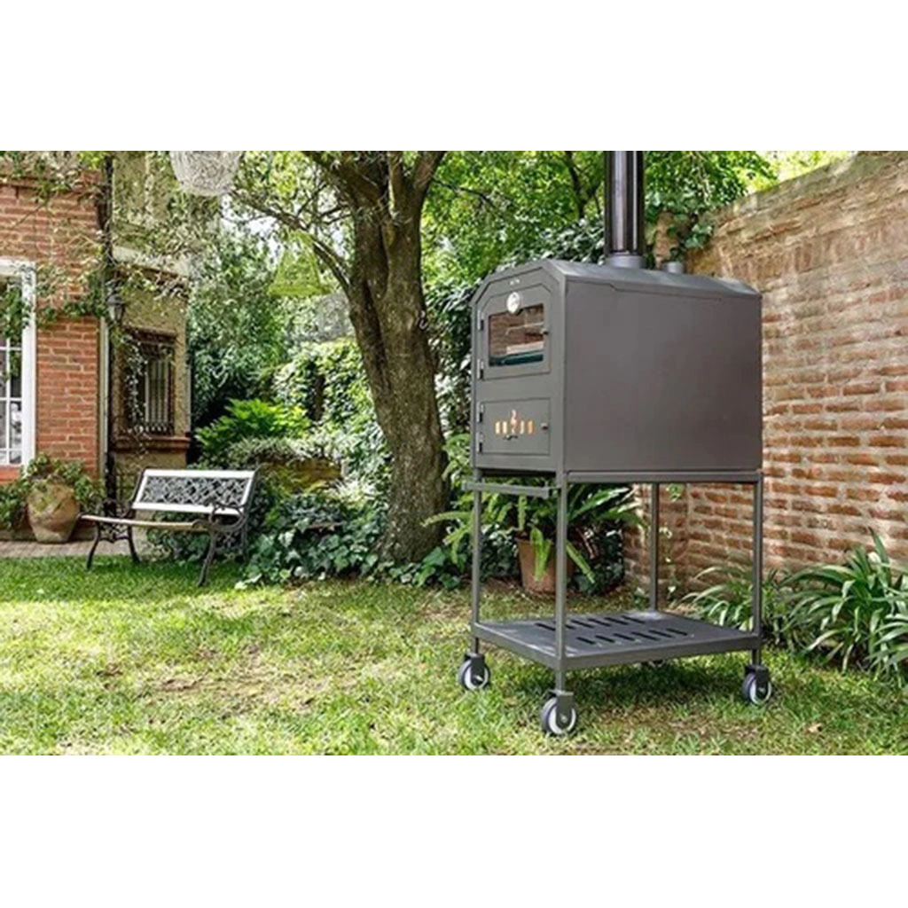 En la cámara de combustión de refractarios se quema la leña y sus gases los cuales chocan con el deflector y se dirigen hacia los laterales y luego hacia el techo por donde sale por la chimenea, de esta forma envuelve el calor al horno interno el cual esta enlozado y tiene una salida de vapor de cocción, viene con dos parrillas y una asadera. Viene en tres versiones, para embutir, con y sin carro.