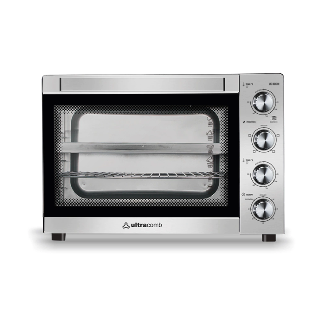 UC 80CINHorno eléctricoHorno eléctrico con control de temperatura superior e inferior independiente.Nuevo diseño exclusivo en acero inoxidablePotencia 1900WCapacidad 80 litrosAsa ergonómica con acero inoxidableAjuste de temperatura de alta precisión (70°C a 250°C)Selector para distintos tipos de cocciónFunciones para: hornear / asar / convecciónTemporizador de 60 minutosTemperatura de cocción homogénea mediante Turbo ConvecciónLuz interiorBandeja, rejilla & pinza extractora.Ideal para todo tipo de horneados: masas/bizcochuelos/pizzas/panes