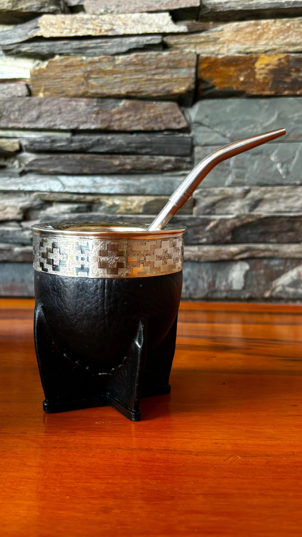 Mate imperial de alpaca, cuero y calabaza + pico de loro de acero.El diseño de la guarda puede variar segun stock.