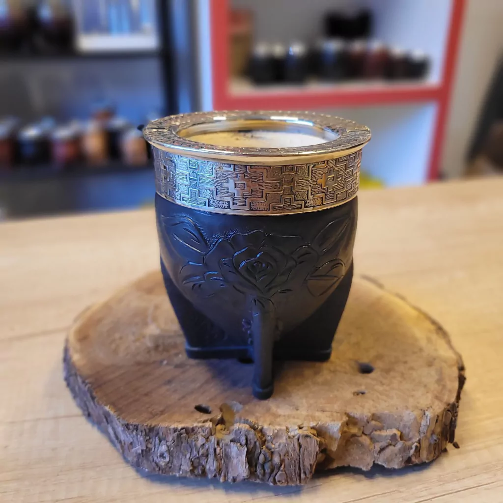 MATE IMPERIAL DE ALPACA CON VIROLA CINCELADA, APLIQUES DE BRONCE PURO Y CUERO LABRADOCALABAZA BRASILERAFORRADO EN CUERO VAQUETACOLORES MARRON Y NEGRO
