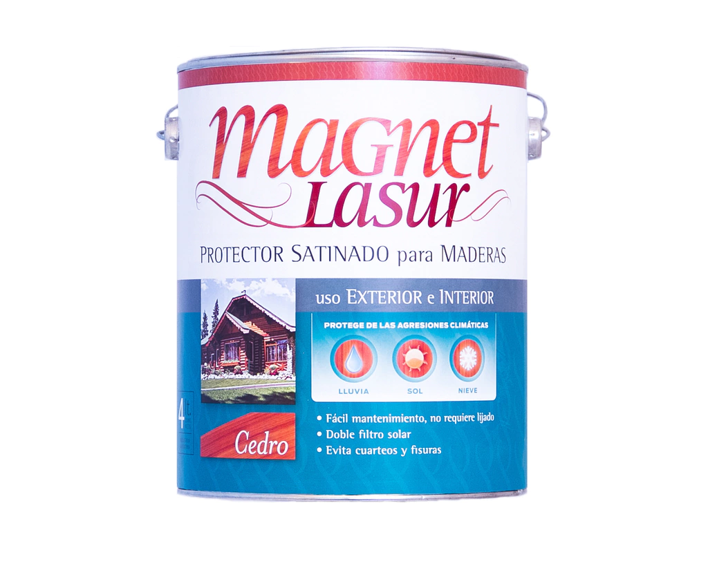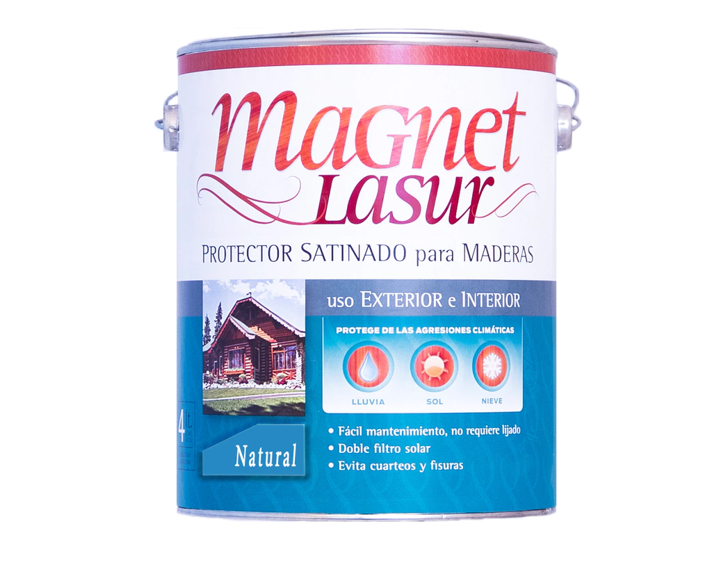 Producto: Impregnante Lasur MagnetEnvase: 4 litrosColores Disponibles: Natural , Cedro y CaobaCualidades:1) IMPREGNACION PROFUNDA: Penetra profundamente en la madera, impregnando y sujetando sus fibras, lo que evita cuarteos y fisuras.2) MANTIENE LA BELLEZA NATURAL DE LA MADERA: Presenta un acabado satinado e incoloro que realza la textura y las vetas de la madera.3) REPELE EL AGUA: Posee poderosos agentes repelentes del agua que evitan su acción destructiva, pero permite respirar a la madera para que elimine la humedad residual que pudiera contener.4) ANTIHONGO Y ANTIVERDIN: Contiene productos químicos que impiden la contaminación y el deterioro que provocan el verdín y los hongos.5) FACIL MANTENIMIENTO: Como no forma película superficial, no es necesario removerlo. Sólo se debe limpiar la superficie con un trapo embebido en aguarrás y ya esta lista para pintar.6) RETARDA EL ENVEJECIMIENTO DE LA MADERA: Está elaborada con doble filtro solar para evitar la acción deteriorante de los rayos UV-A y UV-B. Además se ha incorporado HALS, un moderno desactivante de sustancias inestables producidas por la luz, denominadas Radicales Libres, que degradan los tejidos.7) COLOR A ELECCION: Este producto se presenta solamente en terminación transparente, Cedro o Caoba.Pero con el agregado de TINTAS ACRILICAS, de hasta un máximo de 50 cm³ por litro, obtendrá el tono de su agrado.8) RENDIMIENTO: Rinde aproximadamente entre 10 y 14 m² por litro y por mano, según el grado de absorción de la madera.--------------------------ENVIO:Realizamos envío a domicilio a todo el país.--------------------------FACTURA:Emitimos Factura A o B.