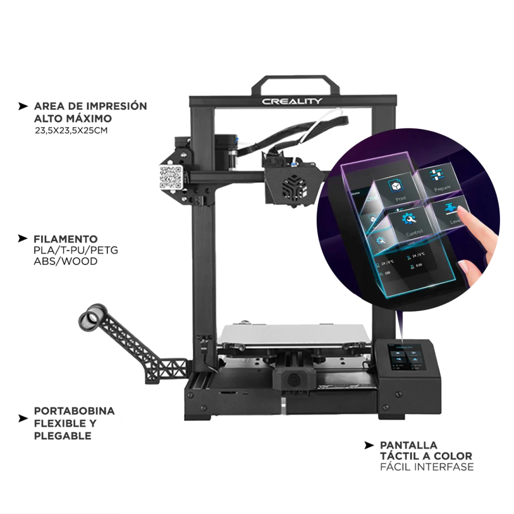 IMPRESORA 3D CREALITY CR-6 SE FDMLa CR-6 SE es una FDM abierta, de simple extrusor y hot end de 260º, muy robusta. Se ensambla en 5 minutos, y viene precalibrada de fábrica por lo que tardarás nada en imprimir después de montarla -solamente hay que unir el soporte del cabezal, hacer algunas conexiones, y ya está. Ha sido totalmente rediseñada a partir de las Ender-3 V2 y es silenciosa, muy fácil de usar y sobre todo muy fiable. Posee cama de cristal de carburo de silicio- autonivelable, con sensores de presión, su pantalla LCD a color y táctil de 4,3 y su nuevo cabezal de impresión modular, con una nueva ventilación optimizada y que facilita el mantenimiento. Tiene una mejor resolución de capa de 100 micras, un volumen de impresión de 235 x 235 x 250 mm, ranura para tarjetas SD y puerto ethernet.CARACTERÍSTICASMarca: CrealityModelo: CR-6 SELínea: CRPeso: 9,5kgGarantía: 12 mesesTecnologia de modelado: FDMGrosor de capa: 0,1 - 0,4mmXY punto de precision: 0,01mmArea de impresion: 235*235*250mmResolucion de impresion: 0,1mmSoftware slicer: creality slicer/Cura/Reptier-Host/Simplify3DTeperatura de boquilla: 260°CDiametro de boquilla: 0,4mm (mas opciones incorporadas)Temperatura de la cama: 110°CTransferencia de archivos: USB / tarjeta SDMedidas de la impresora_ 442*462*540mmIdiomas: Chino, InglesFormato de los Archivos: STL, OBJ. AMFPlaca Base ultra silenciosaVoltaje nominal: 110V - 240VPotencia nominal: 350WVelocidad de impresion: 80-100mm/sVoltaje output: DC24VPantalla tactil color en 4,3 pulgadasReanudacion de impresion: SIAdmite materiales: PLA/T-PU/PETG, ABS, WOODSensor de filament: sensor foto electricoZ-axis: Dual Z-AxisLibre nivelacionINCLUYE:Impresora 3D Creality Ender CR-6 SE x 1Manual