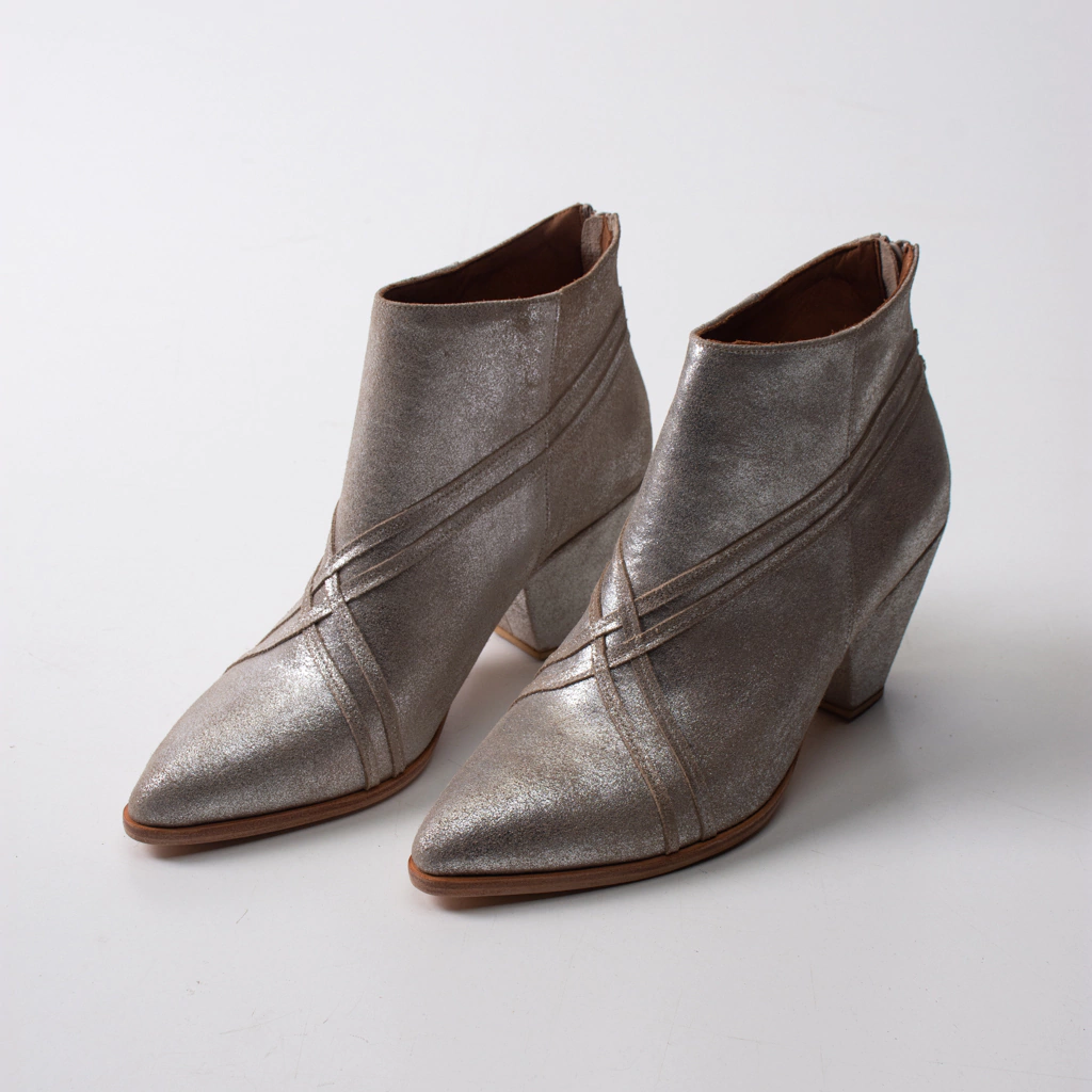 Es increíble la textura de este cuero. 4 tiras muy finas se entrecruzan del talón a sus pies. Su taco de 6 cm con forma triangular y base antideslizante, también está recubierto en cuero vacuno. Cierre en talón.