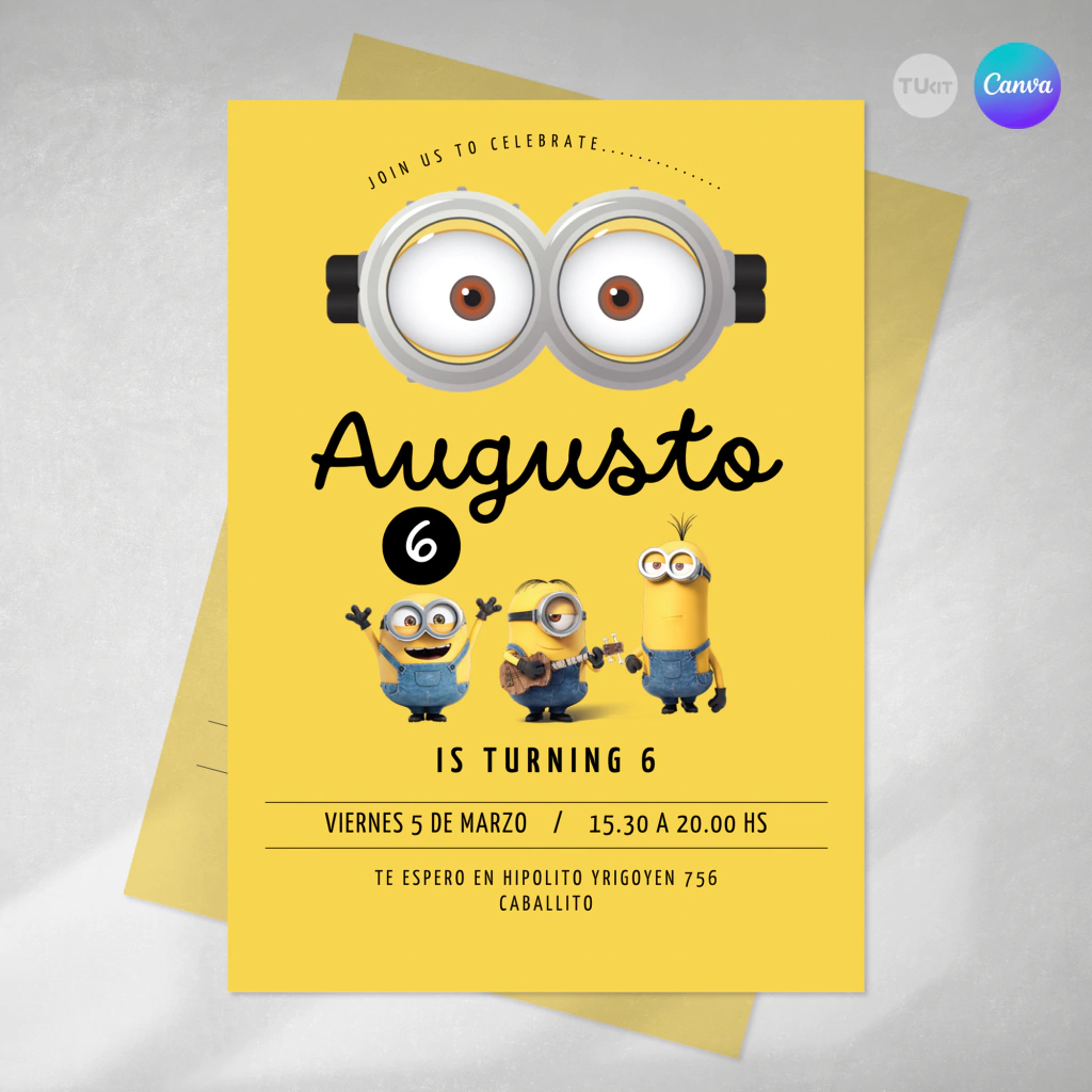 INVITACION MINIONSPODES EDITAR FACILMENTE CON CANVAEL TEXTO de: nombre, fecha y lugar (fuente y color). No la imagen.INCLUYE 1 ARCHIVO PDF - link invitación whatsappINCLUYE 1 ARCHIVO PDF - link invitación 5x7 inchesGracias por tu compra!