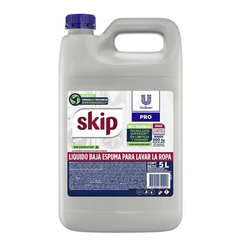 JABON LIQUIDO ROPA SKIP 5LTS (50 LAVADOS). UNILEVER LINEA PROFESIONAL.La ropa evolucionó, Skip tambiénLa sociedad evolucionó y la ropa no se quedó atrás. La ropa que elegimos es una declaración de lo que pensamos, sentimos y creemos. Ya no hablamos sólo de una prenda cuando nos vestirnos, ahora hablamos de expresar lo que somos.Skip Liquido limpia profundamente tu ropa mientras la protege de los 5 signos de daño gracias a su exclusiva tecnología FIBERCARE SERUM. Ideal para el cuidado de todo tipo de telas. Conocé las ventajas que tiene para ofrecerte nuestro jabón líquido baja espuma.Skip ama tu ropa, y te acompaña para que puedas expresarte a pesar de las etiquetas.Evolucionamos, tanto, que dejamos las etiquetas solo para la ropa.PRINCIPALES BENEFICIOS:1. Elimina las manchas.2. Cuida las texturas.3. Mantiene los colores.4. Reduce el amarillentamiento.5. Previene la formación de pelotitas.