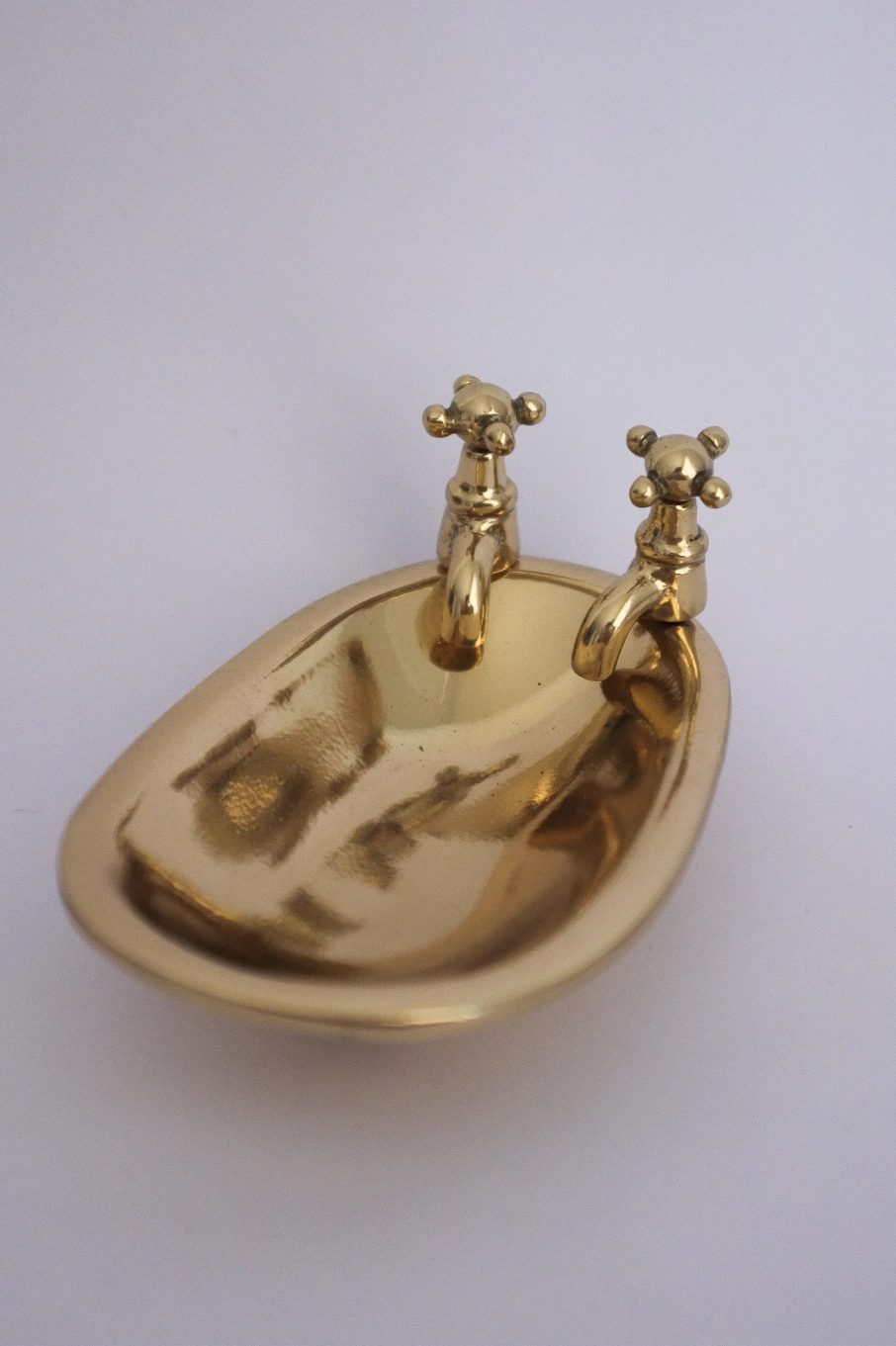 Jabonera con diseño bañera y apliques canillas, fabricada en bronce pulido con laca.Medidas:Profundidad: 15 cmAncho: 10 cmAlto: 7 cm