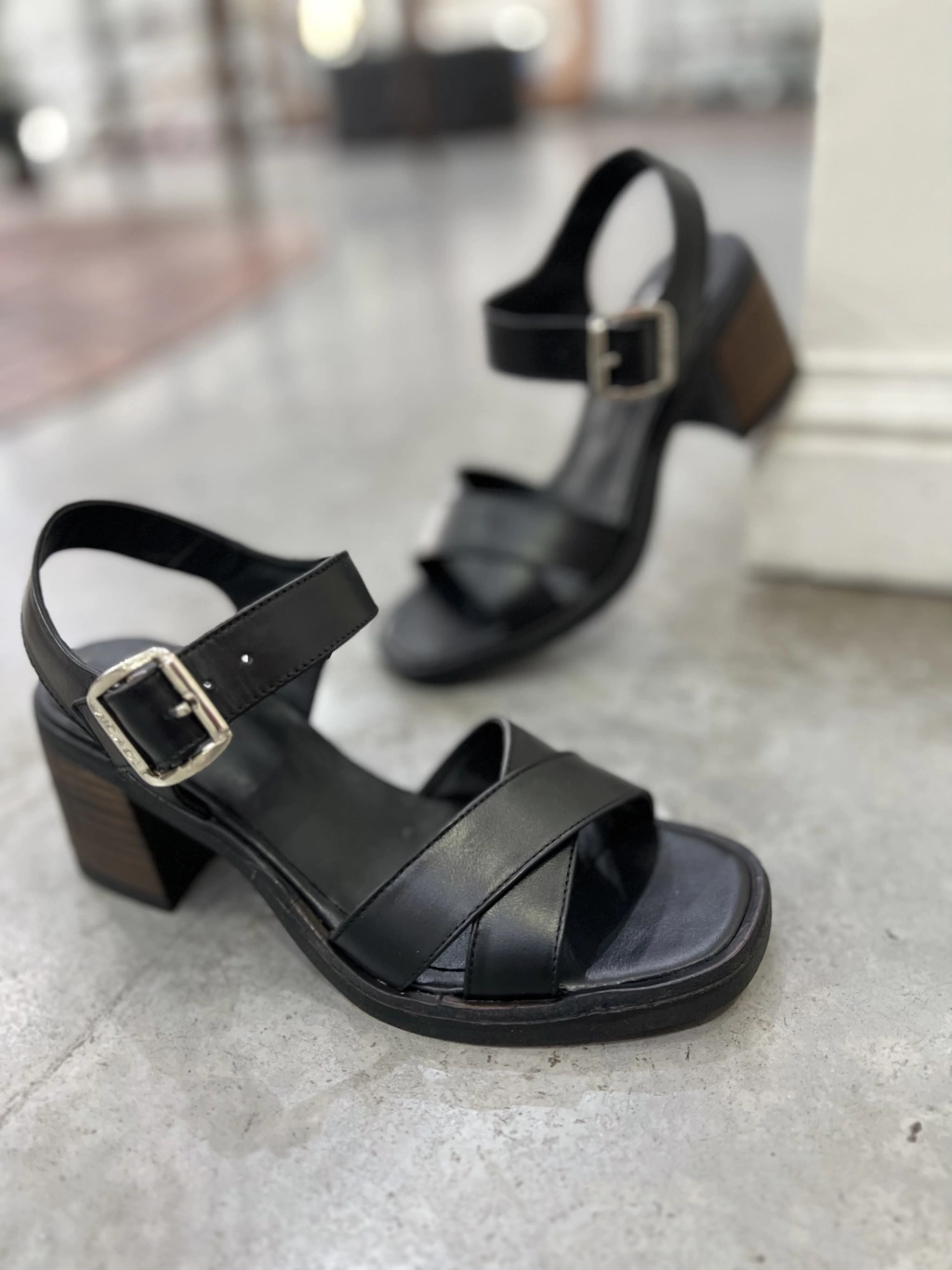 - Sandalia de fiesta con faja cruzada y hebilla- Taco cuadrado separado- Alto de taco 7 cm aprox.
