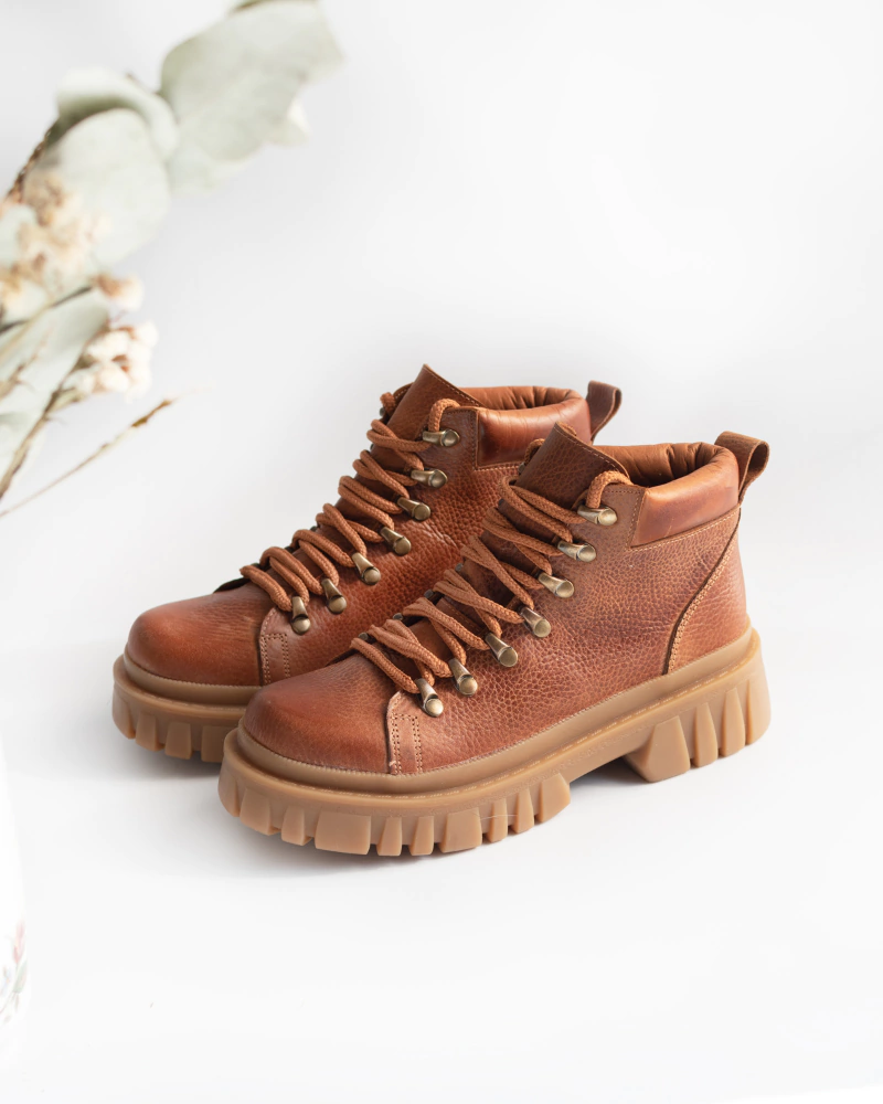 ?Borcego de cuero color suela,interior - exterior, con base inyectada de 4 cm y 8 cm de caña desde el talon. Recorte alchochonado a tono y tira para calzar. Alpinos reforzados color suela. Súper cómodas y livianas. 100% cuero y producto artesanal.