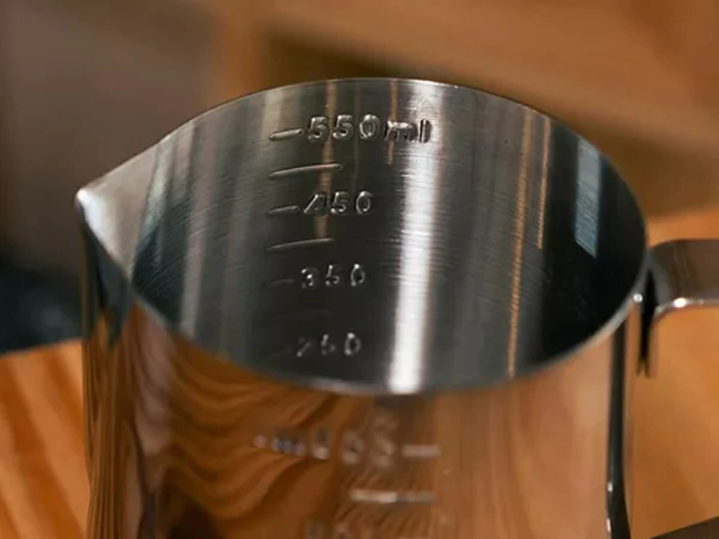 Características- 7,5 de Diámetro en Boca- 9 cm de Diámetro en Base- 11 cm de Altura- 12,5 cm de Ancho con Manija- Pico Vertedor- Cuerpo de Acero Inoxidable- Medidas Grabadas