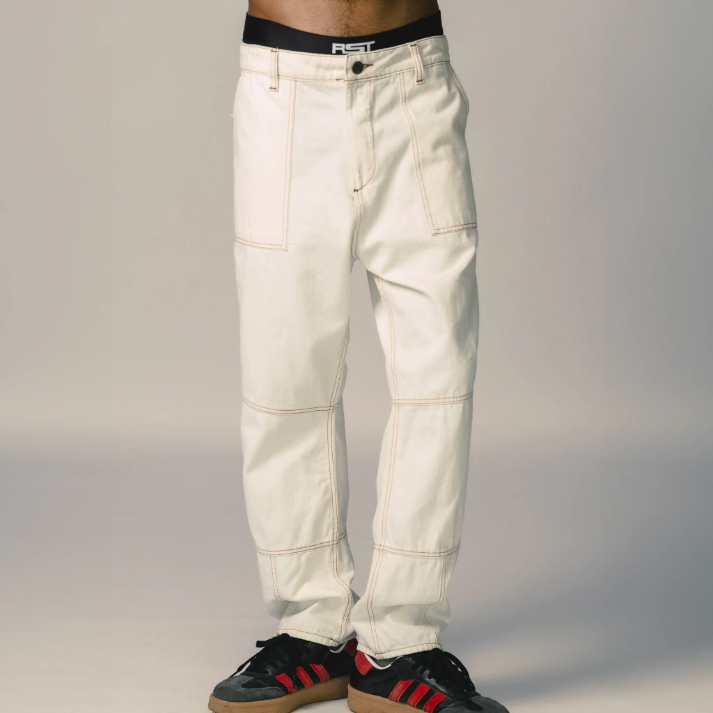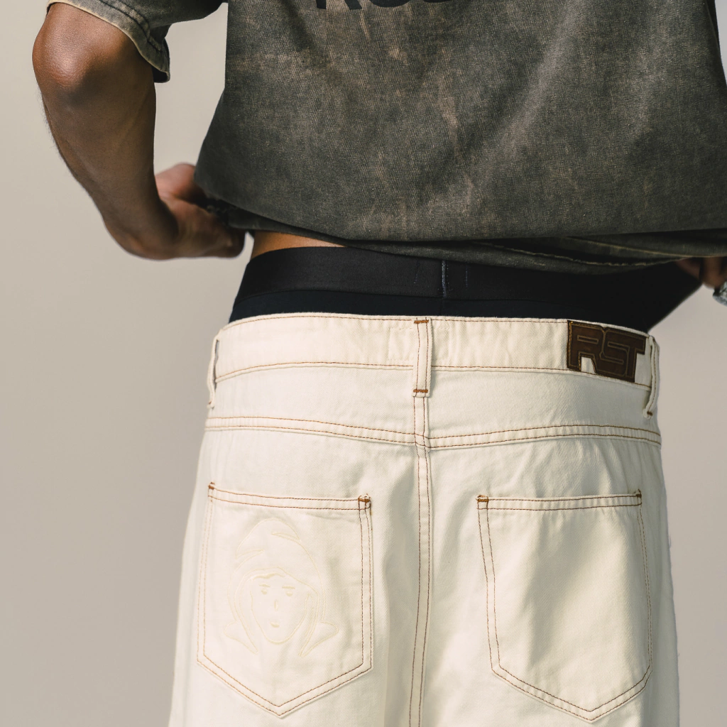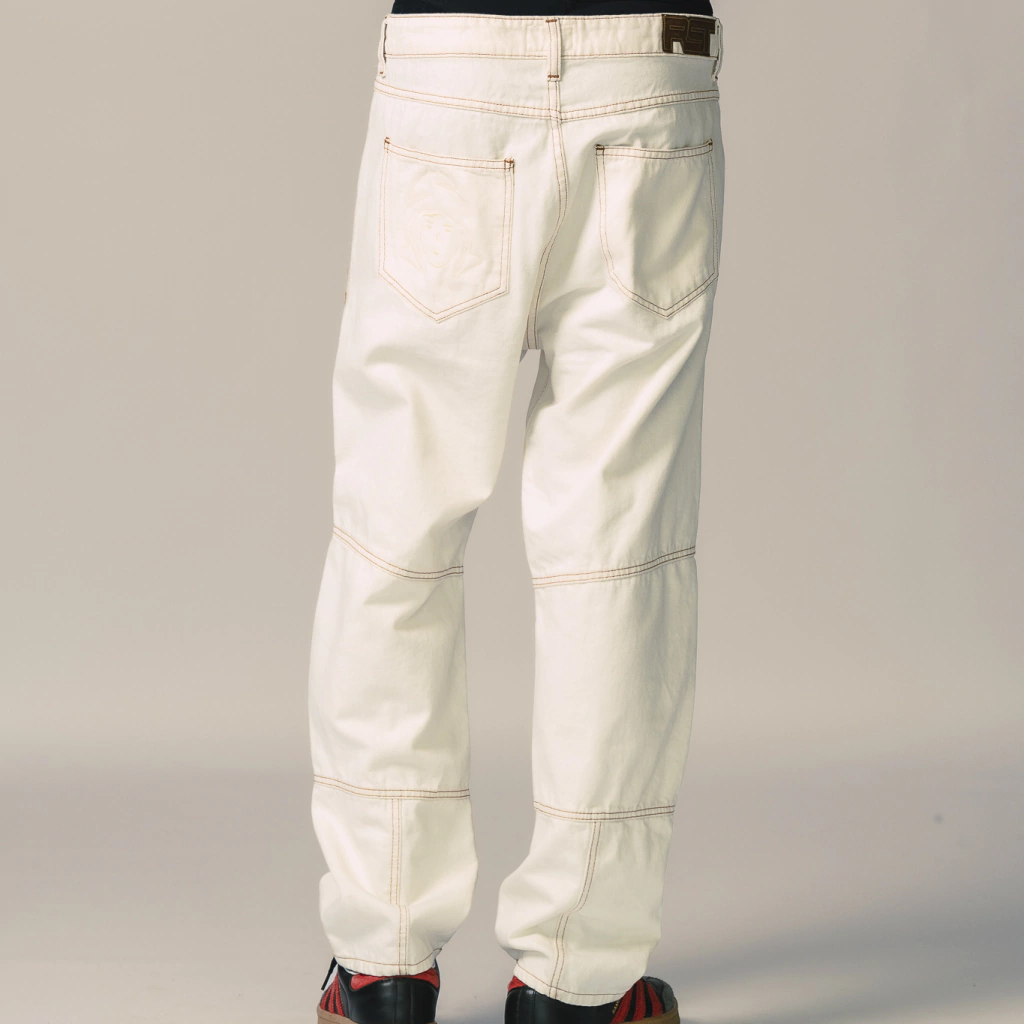 Jean color off white construido con un denim 100% algodón, con recortes a lo largo de la prenda confeccionados con costuras color ocre que diferencian a esta prenda. Cuenta con la impronta de nuestros jeans, su bordado de nuestro isologo en bolsillo trasero, y badana en JL.