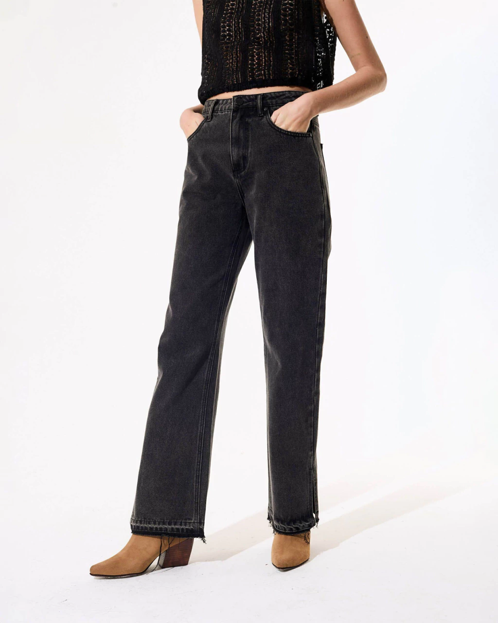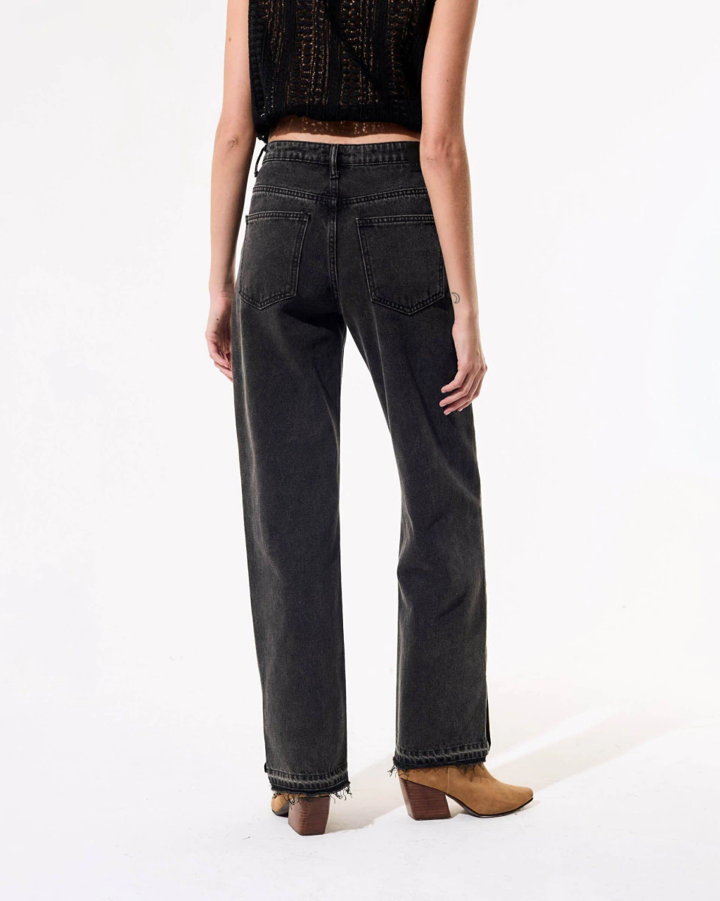 Jean CLARA IBARGUREN recto de tiro medio confeccionado en gabardina 100% algodón, con pespuntes al tono y un lavado con bajada suave de color. Tiene cinco bolsillos, tajos y costura deshecha en el dobladillo generando un efecto canchero de lavado. Cuenta con botones y remaches negro opacos y una badana de cuero al tono con el logo "Clara" en la cintura trasera. En el interior del bolsillo tiene una estampa exclusiva de la temporada.